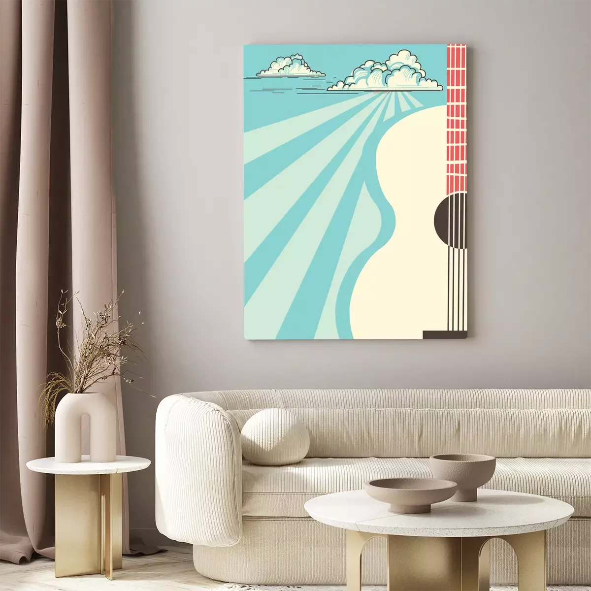 Canvas: Country muziekaffiche met muzikale instrumenten akoestische gitaar. Vector blauwe hemelachtergrond