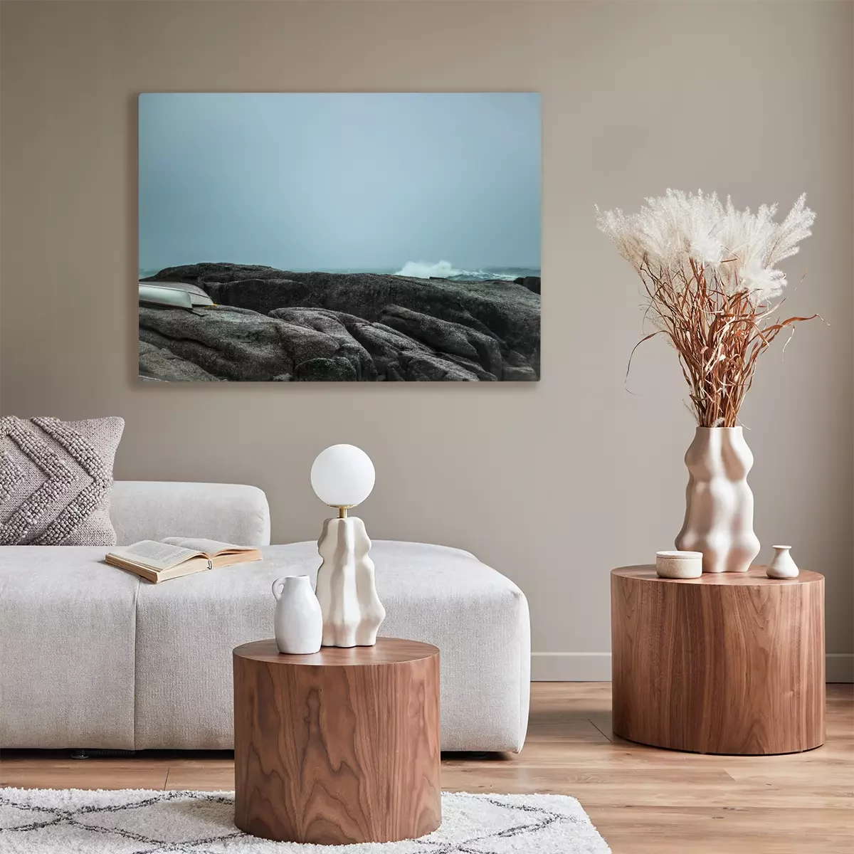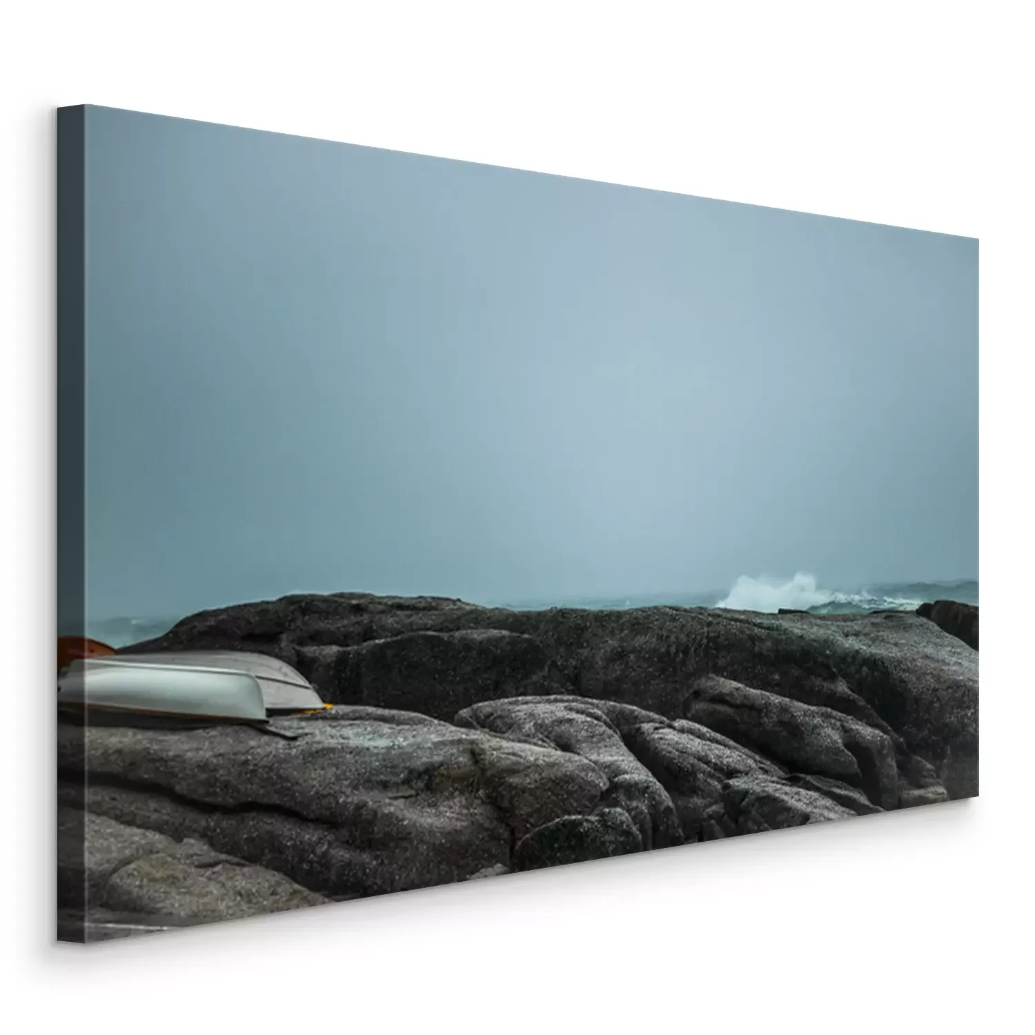 Canvas: Crashing wave onto rocks with boats on a misty overcast day.