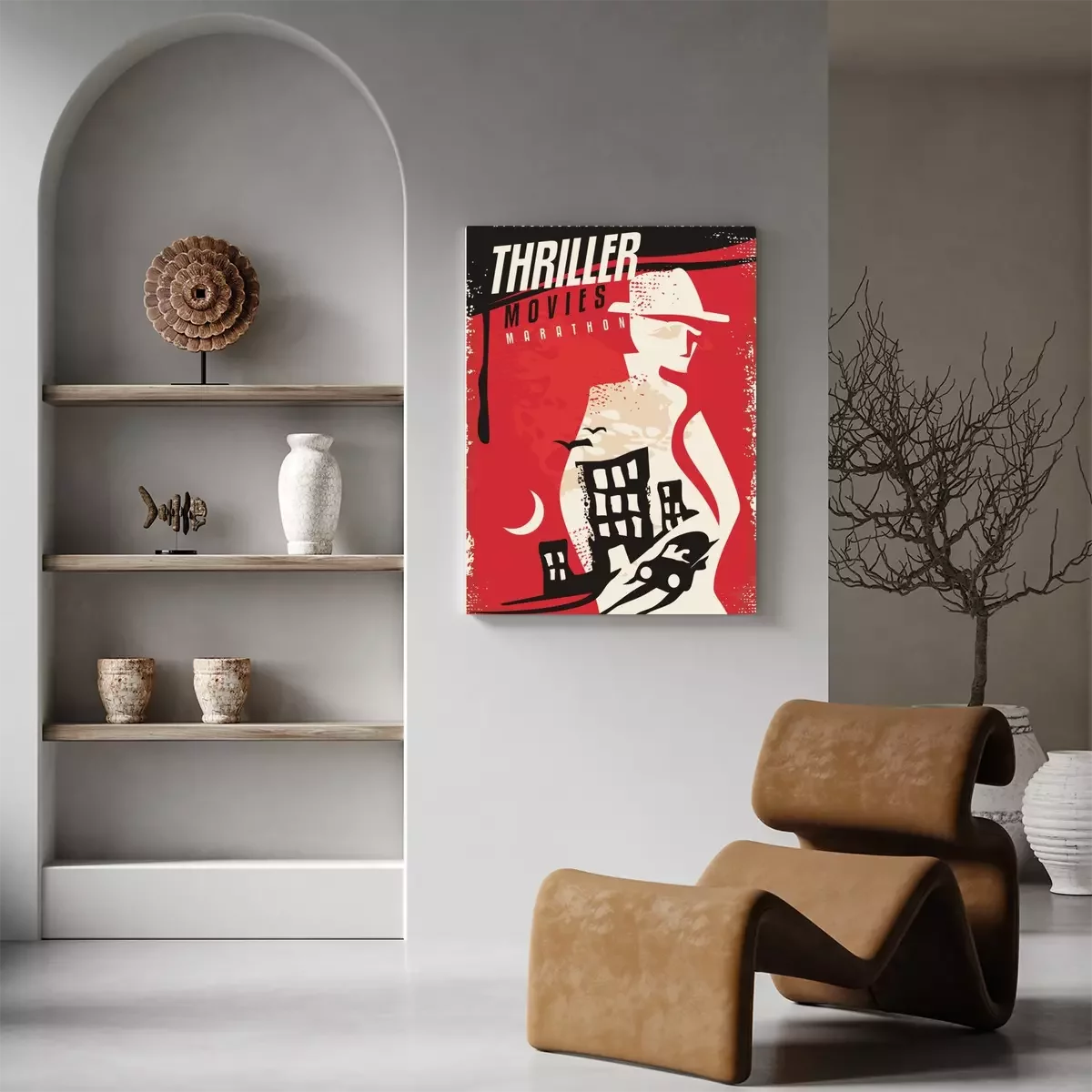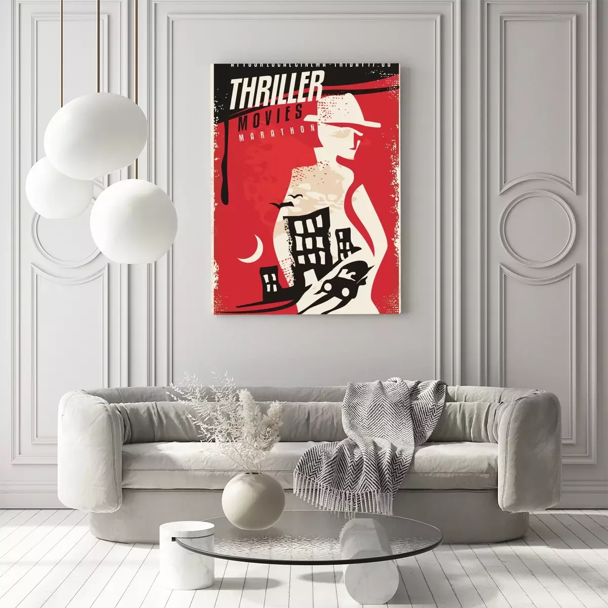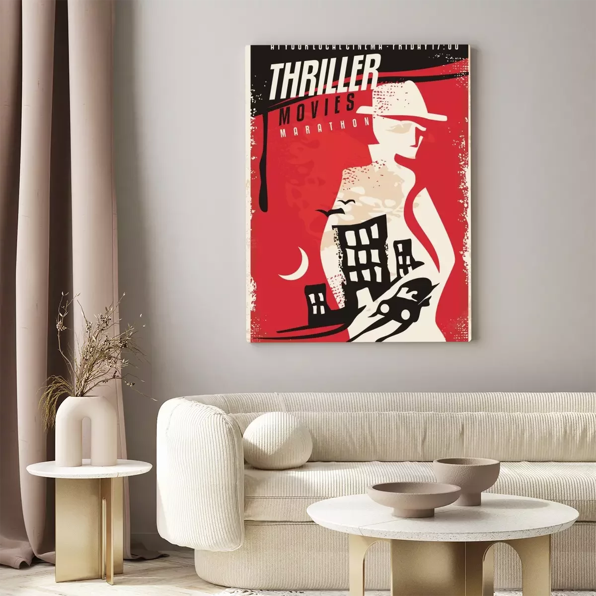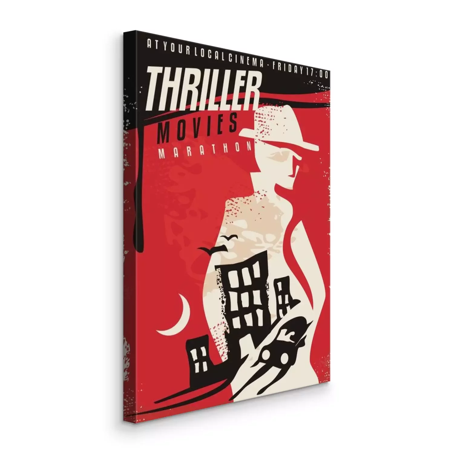 Canvas: Creatief posterontwerp voor thriller-films. Bioscoop poster sjabloon met geheim agent silhouet en nacht stad scène. Vector lay-out.