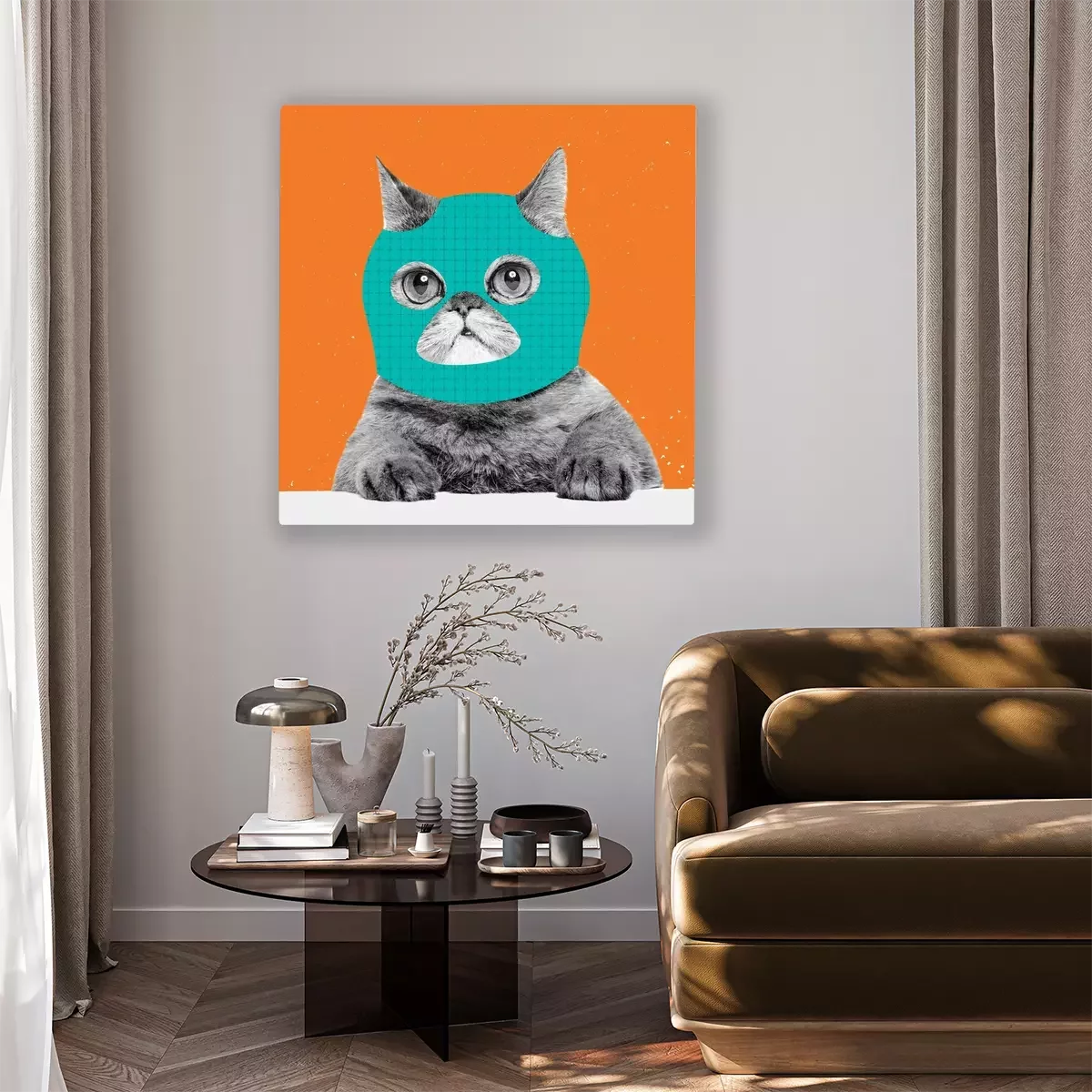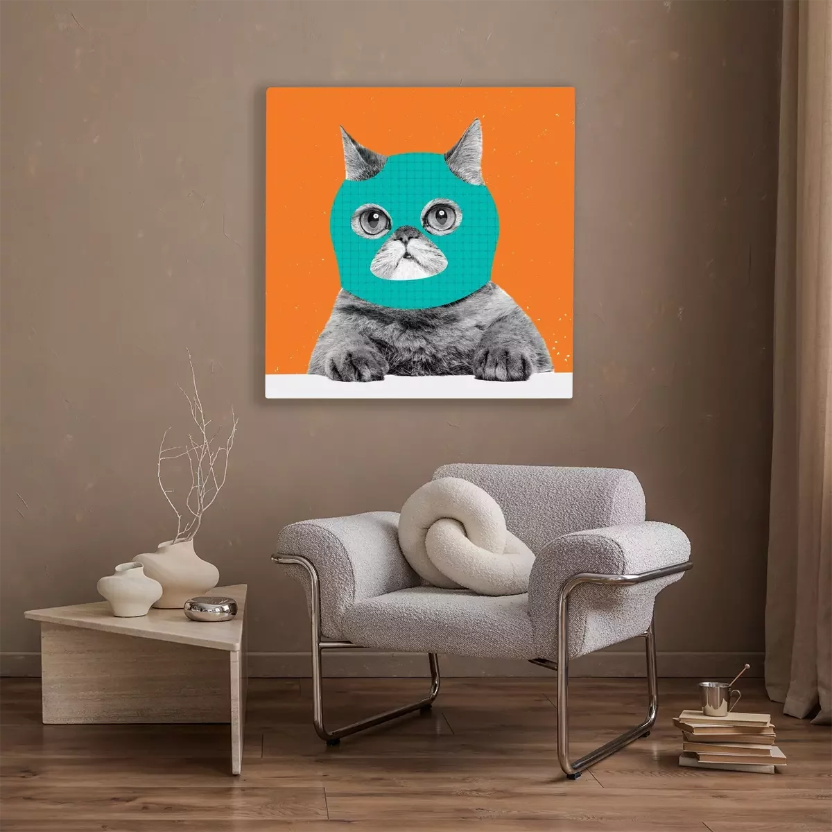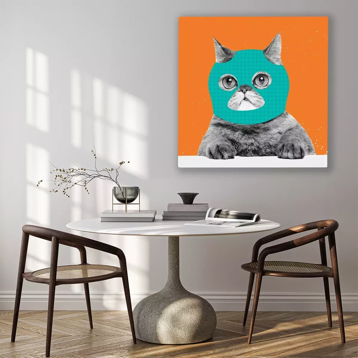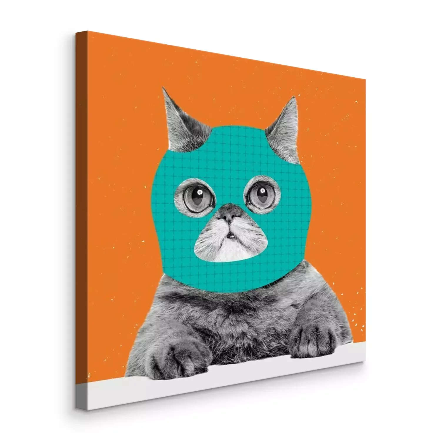 Canvas: Creative portrait of cute cat wearing drawn balaclava isolated on bright neon background. Inspirative art, pets, animal, humor and fashion concept.
