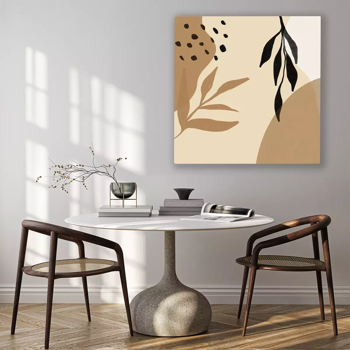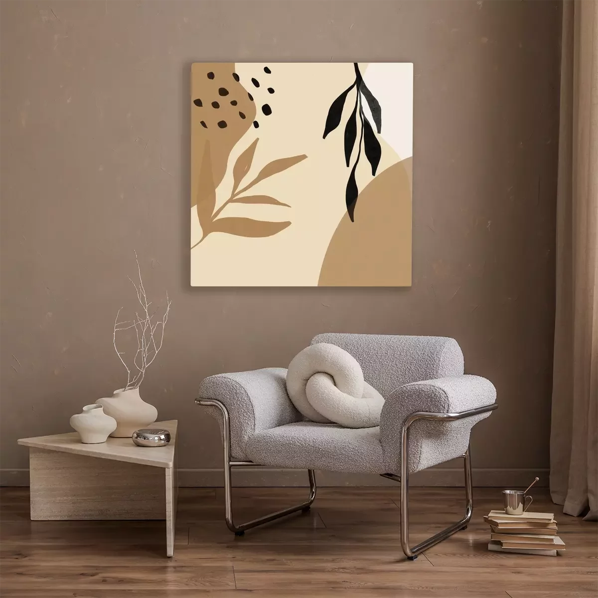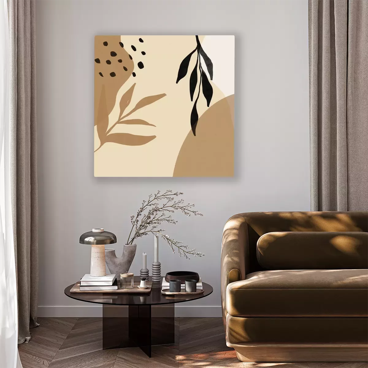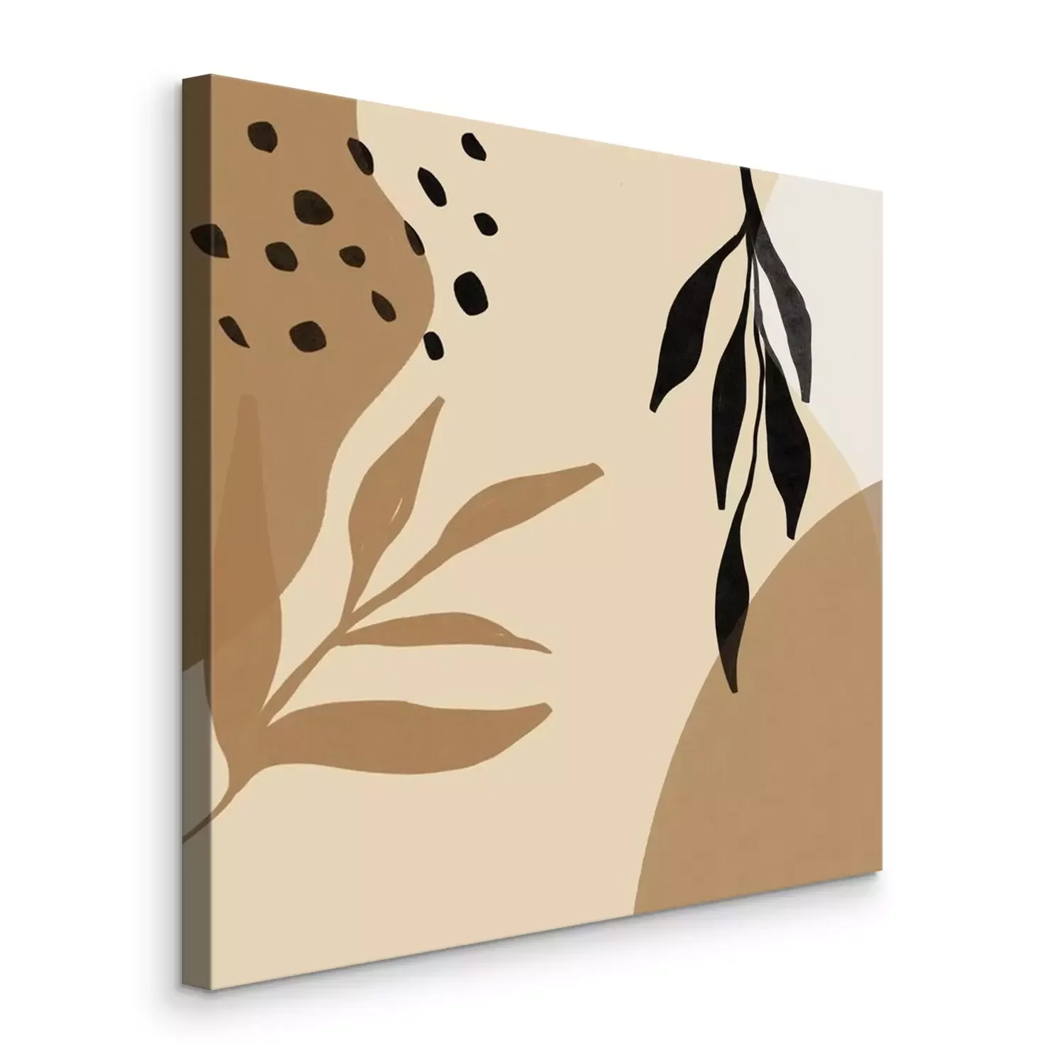 Canvas Creative texture with leaves, contemporary abstract shapes and scribble in paster brown and camel colors. Abstract poster design for wall decor.