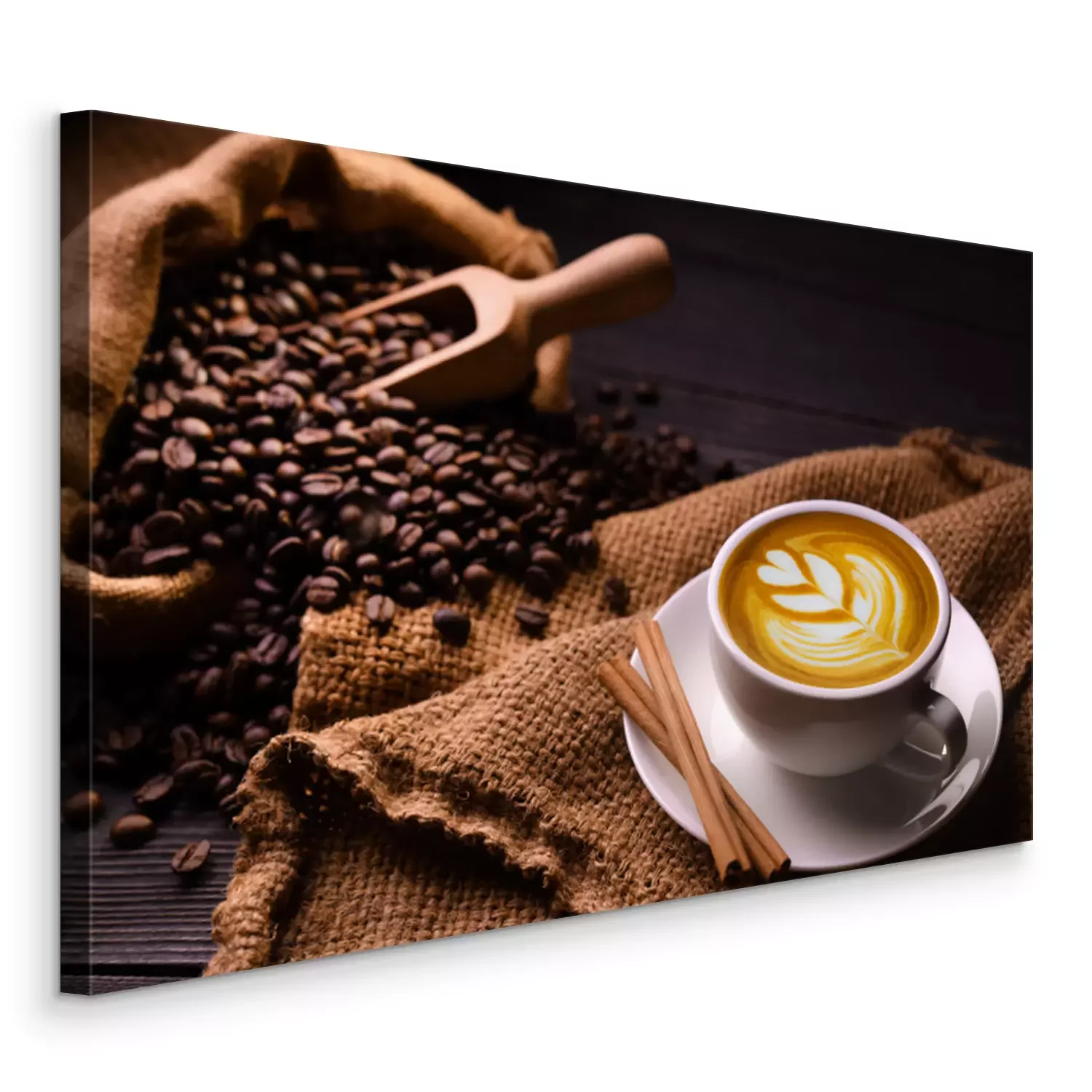 Canvas Cup of coffee latte and coffee beans in burlap sack on old wooden background