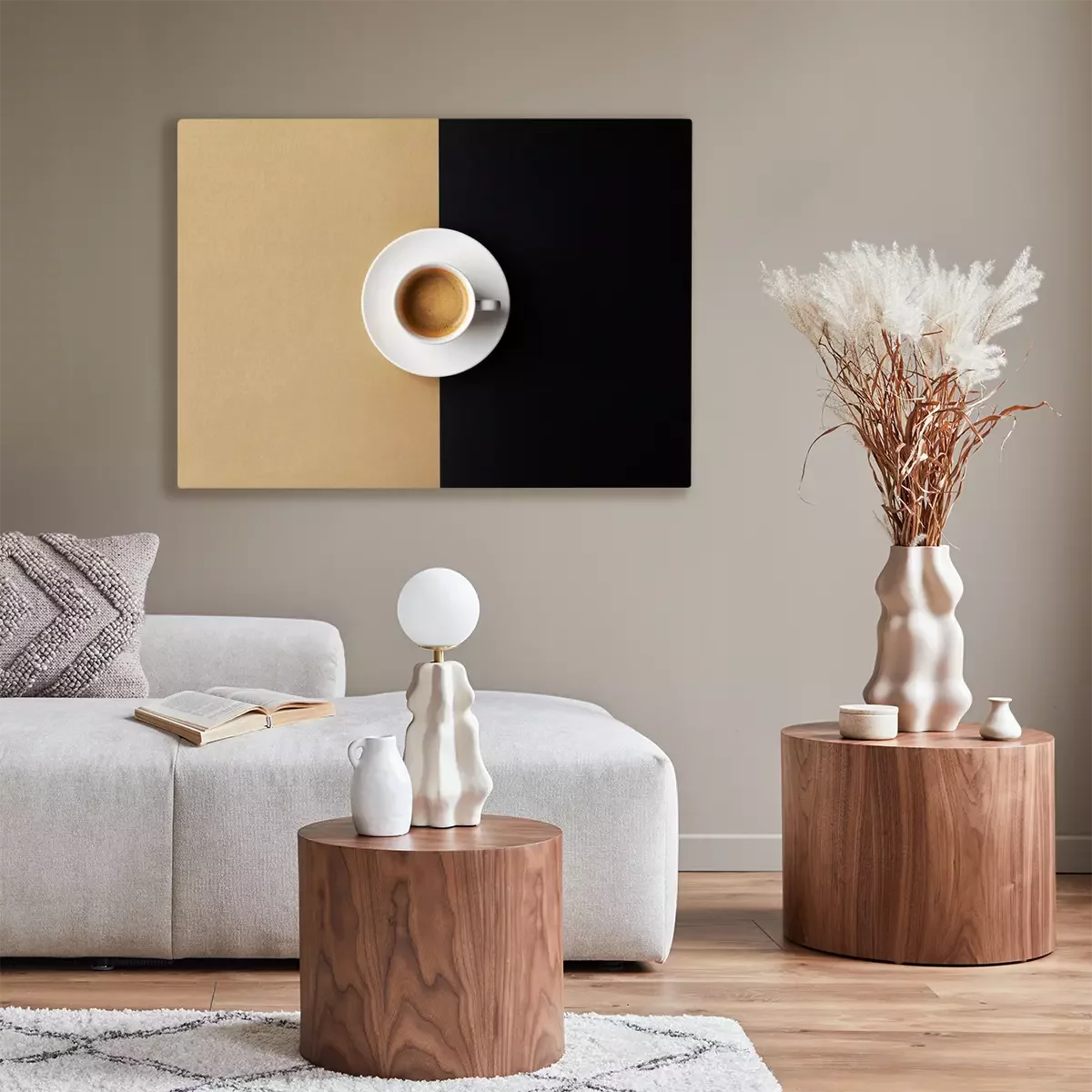 Canvas: Cup of coffee on gold black background. Minimalistic flat lay. Top view.