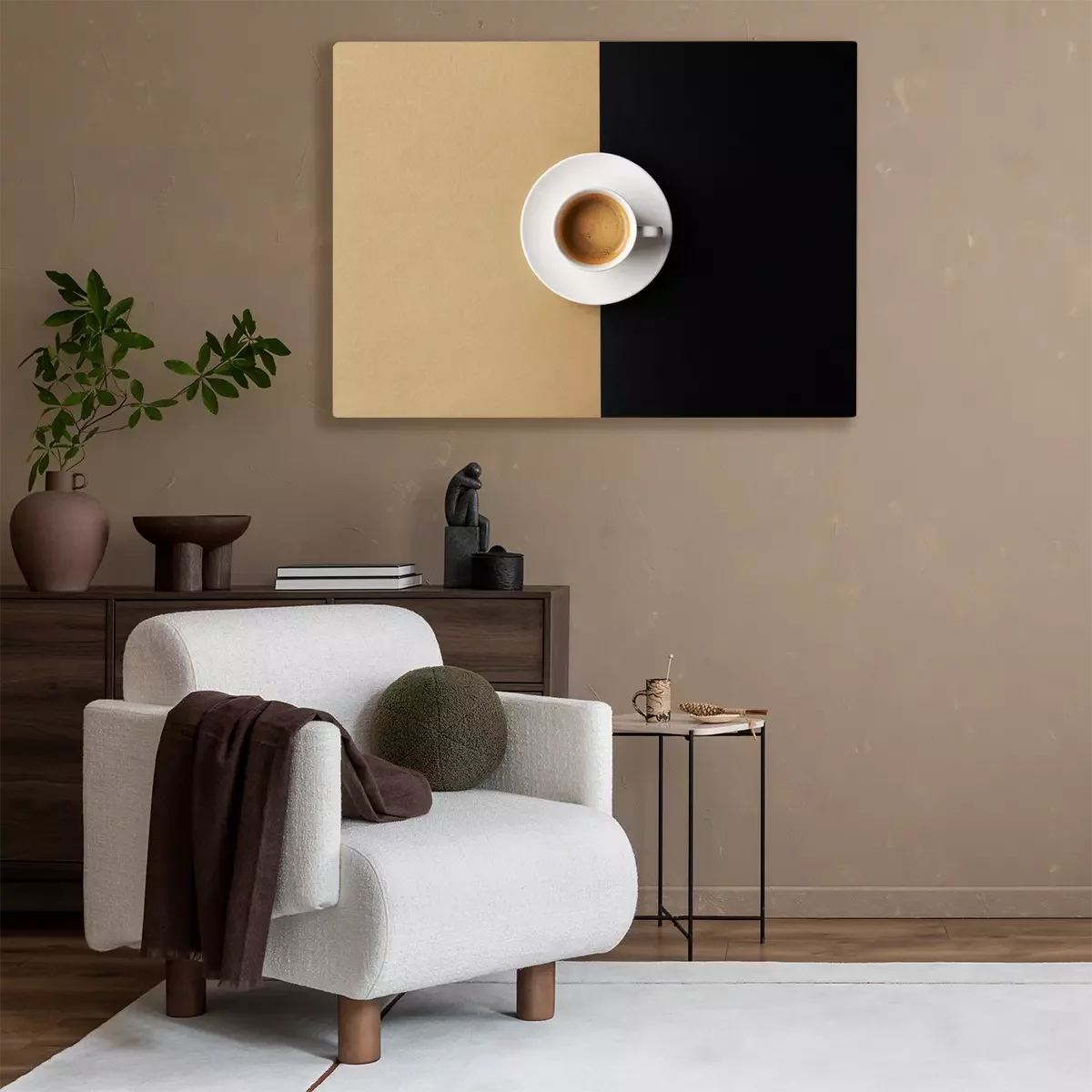 Canvas Cup of coffee on gold black background. Minimalistic flat lay. Top view.