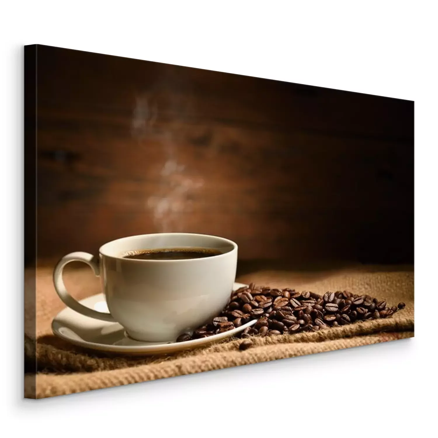 Canvas: Cup of coffee with smoke and coffee beans on burlap sack on old wooden background