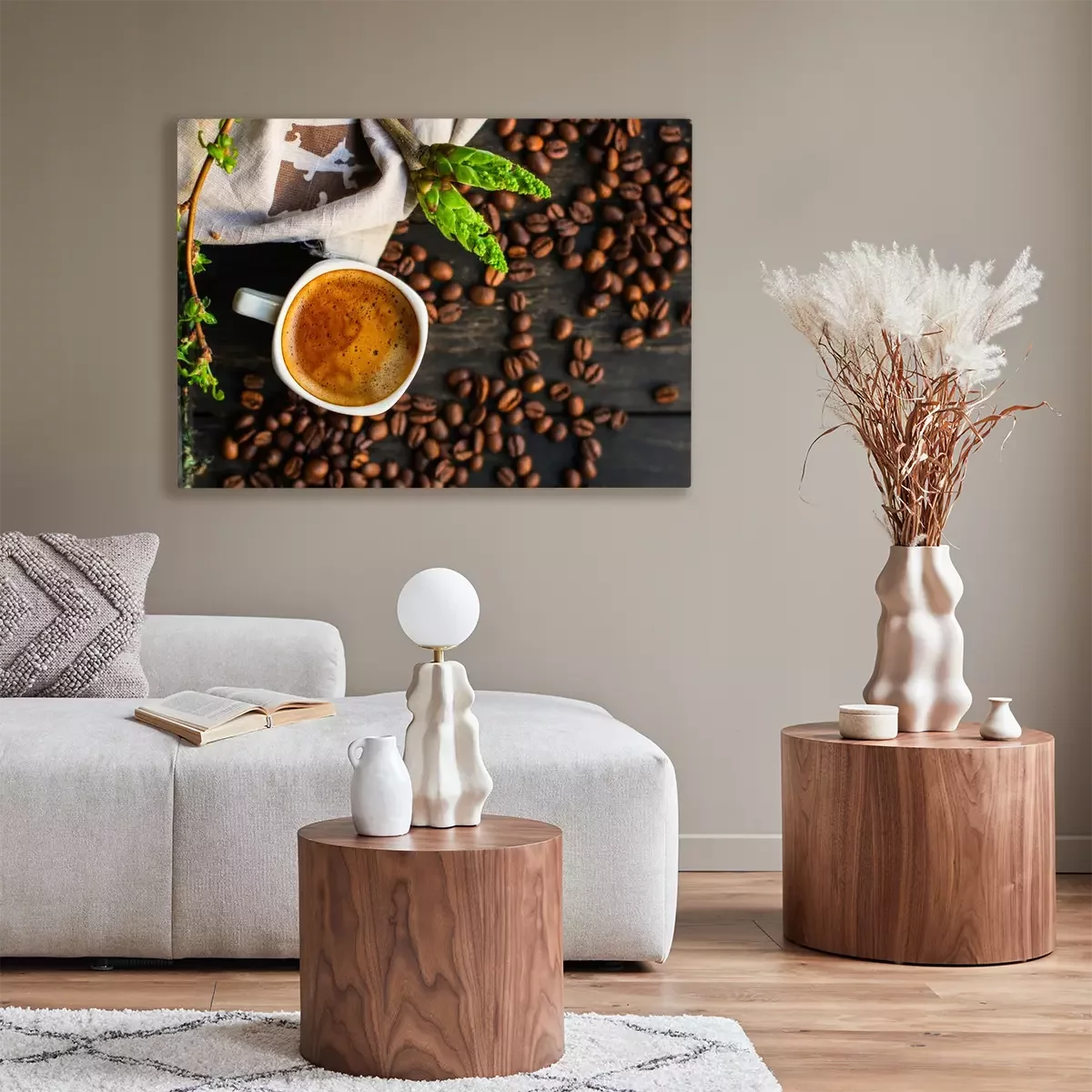 Canvas: cup of hot coffee (coffee beans) - arabica and robusta blend, roasted coffee grain. Black background. Top view. Copy space