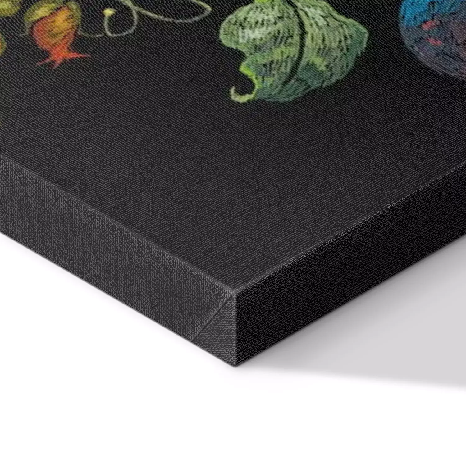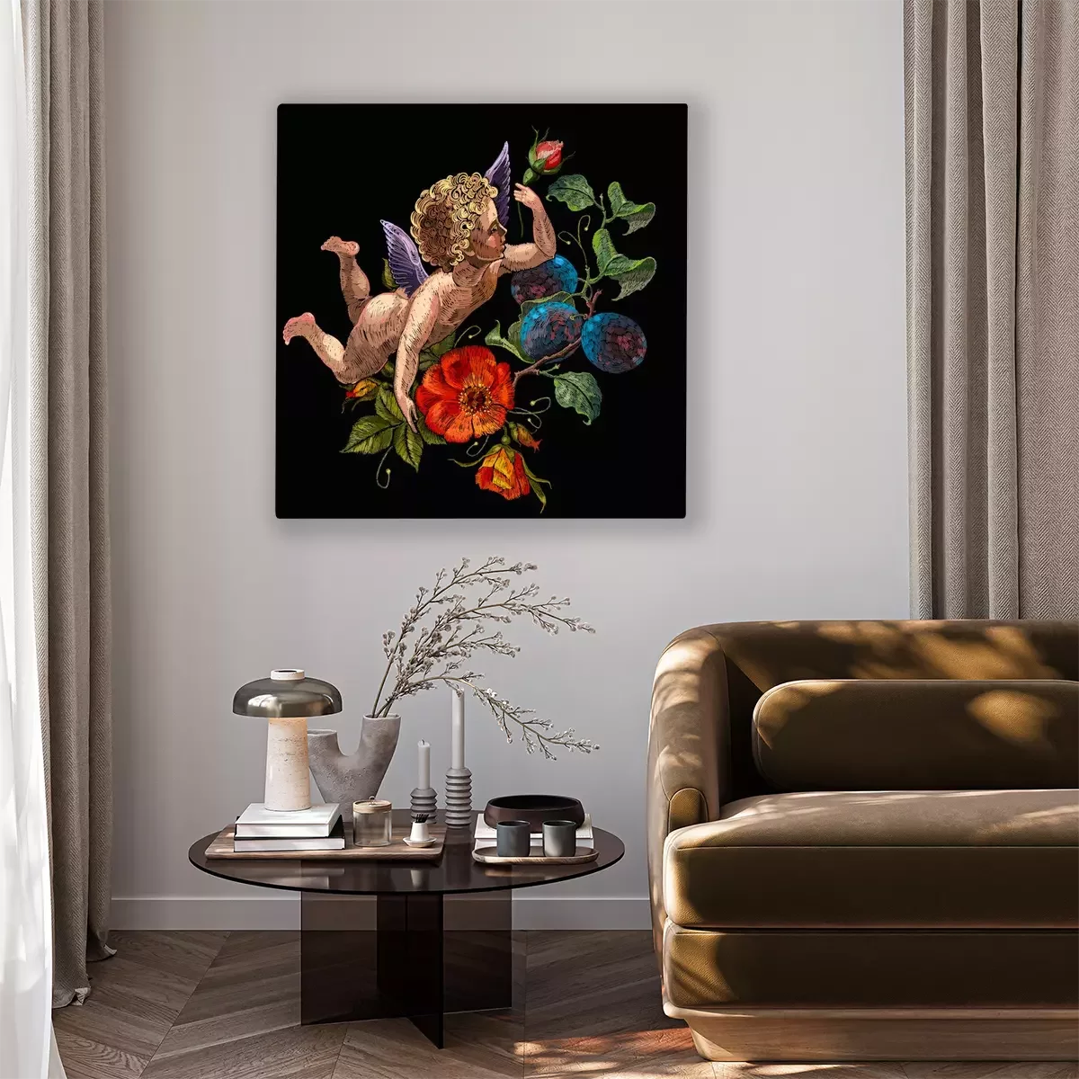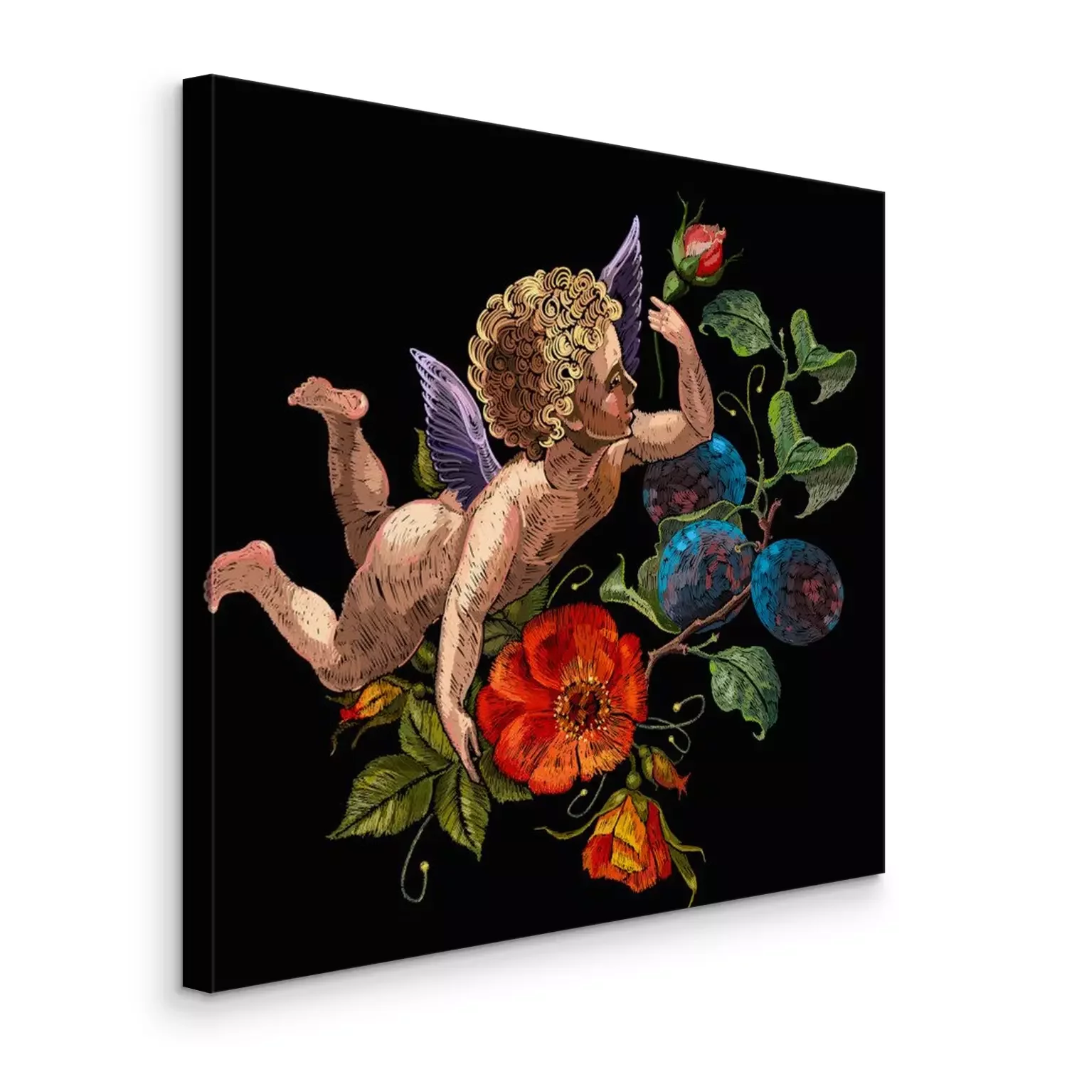 Canvas: Cupido tussen bloemen op een zwarte achtergrond