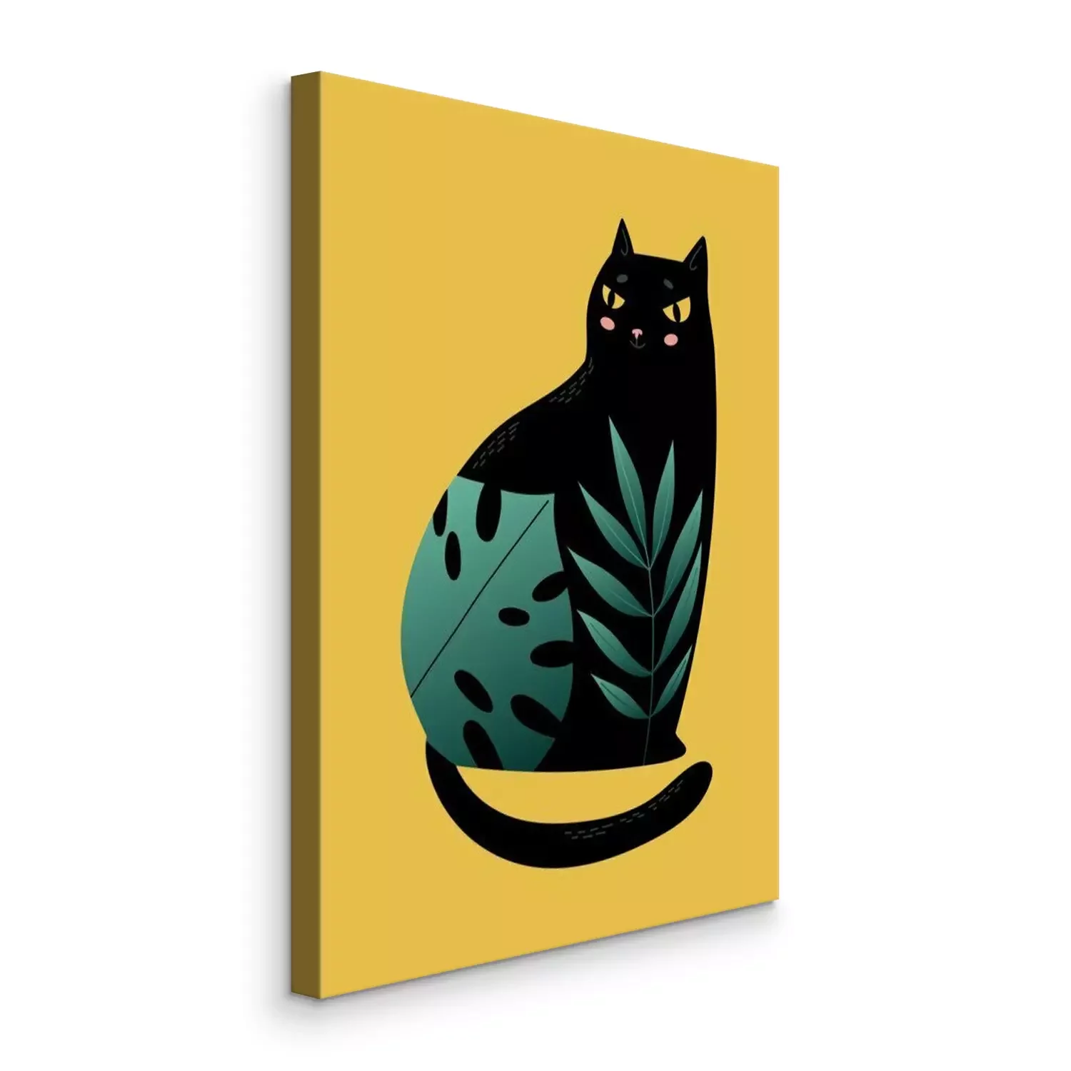 Canvas Cute cartoon black cat with flower and plants. Modern abstract poster, card