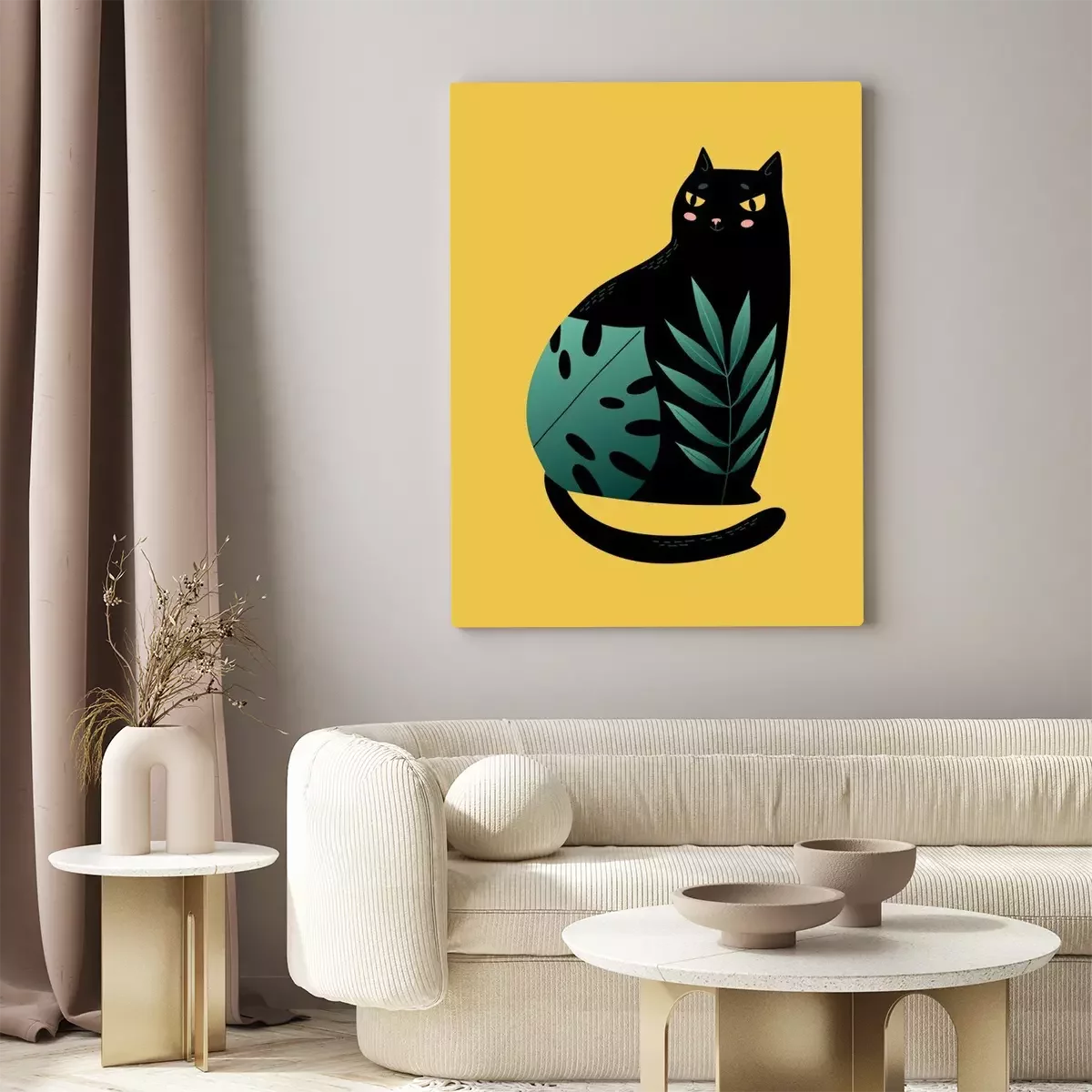 Canvas: Cute cartoon black cat with flower and plants. Modern abstract poster, card