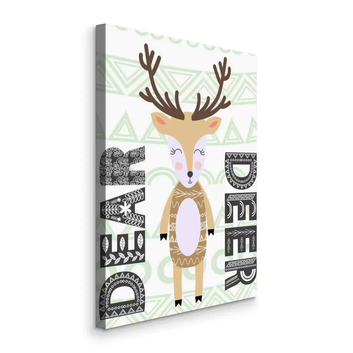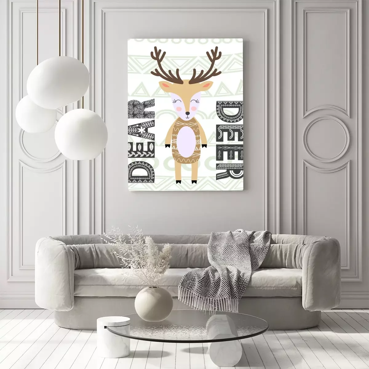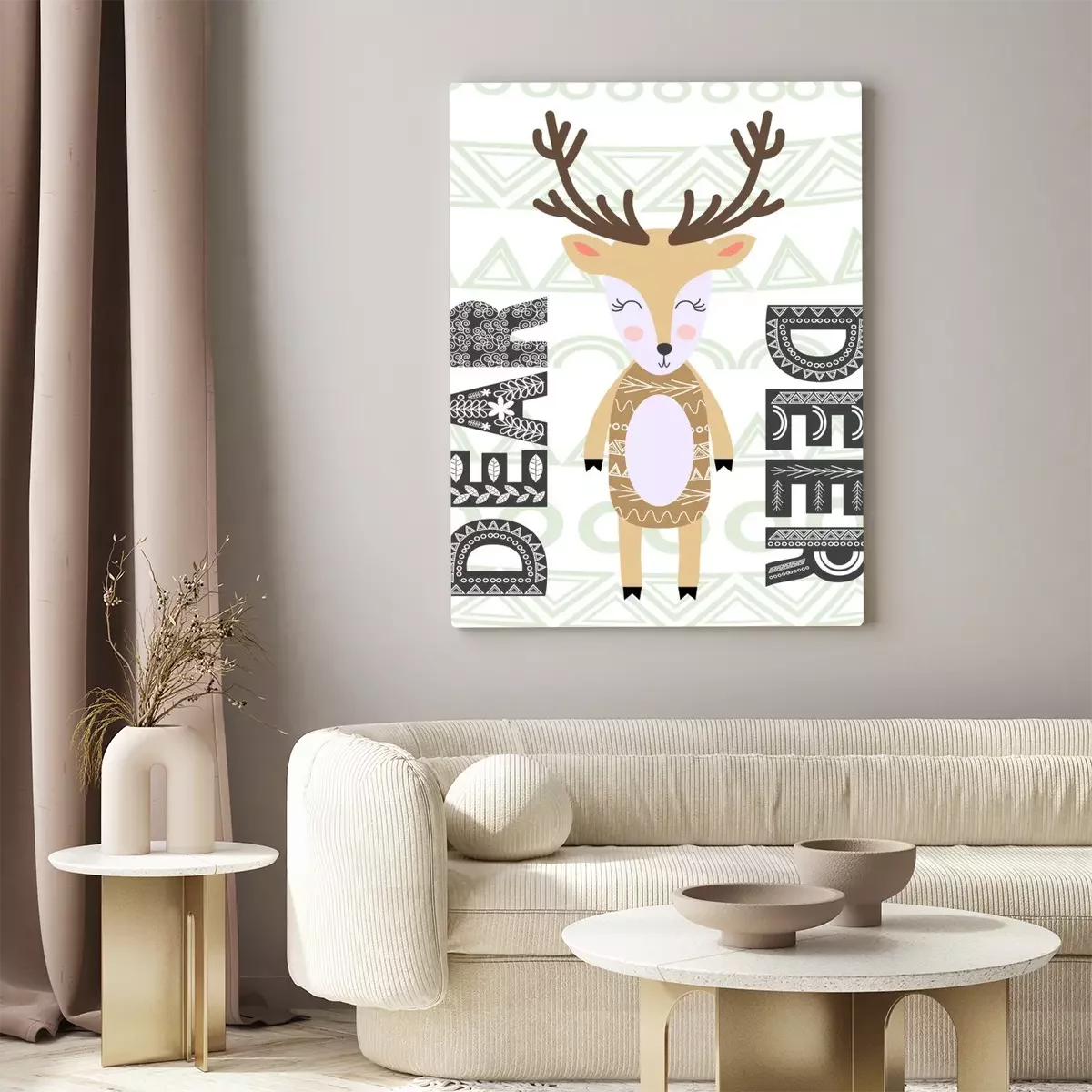 Canvas: Cute cartoon deer. Composition with folk art animals and floral decor elements. Scandinavian style