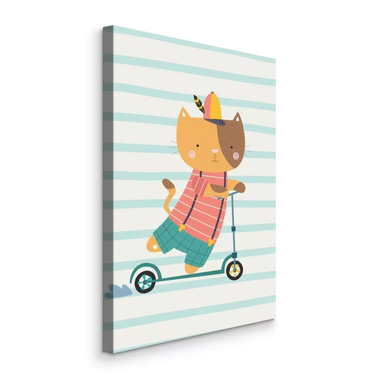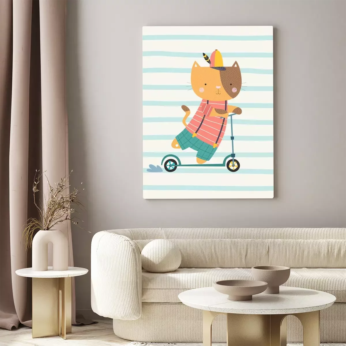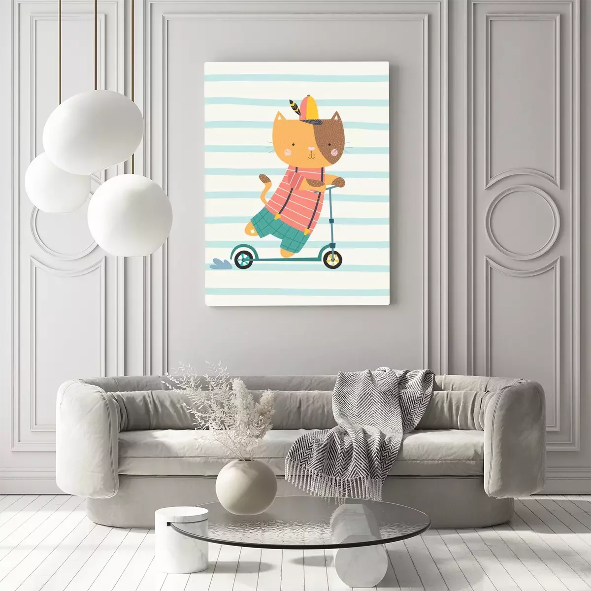 Canvas: Cute cat on a scooter. Vector illustration in a scandinavian style. Cute and funny poster.