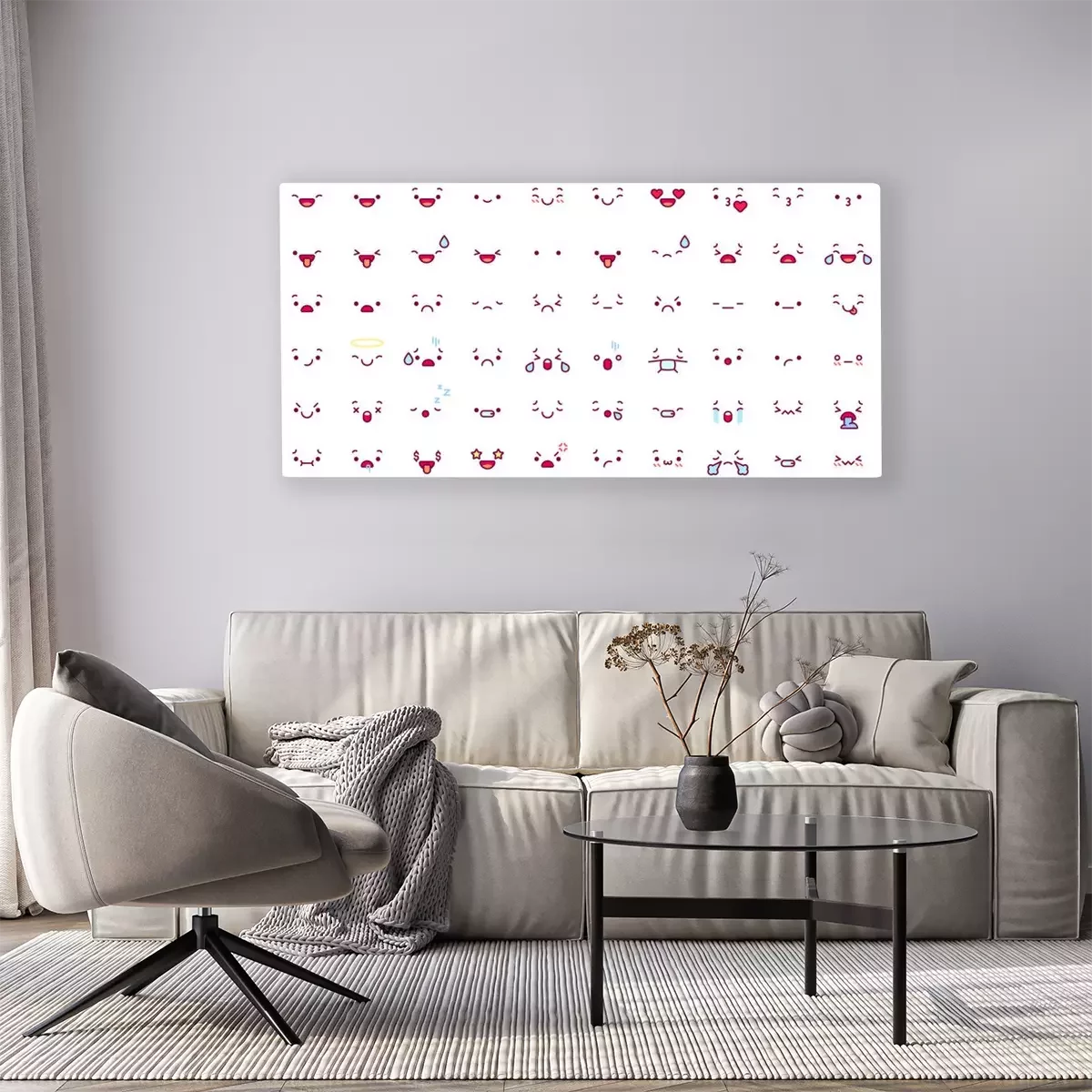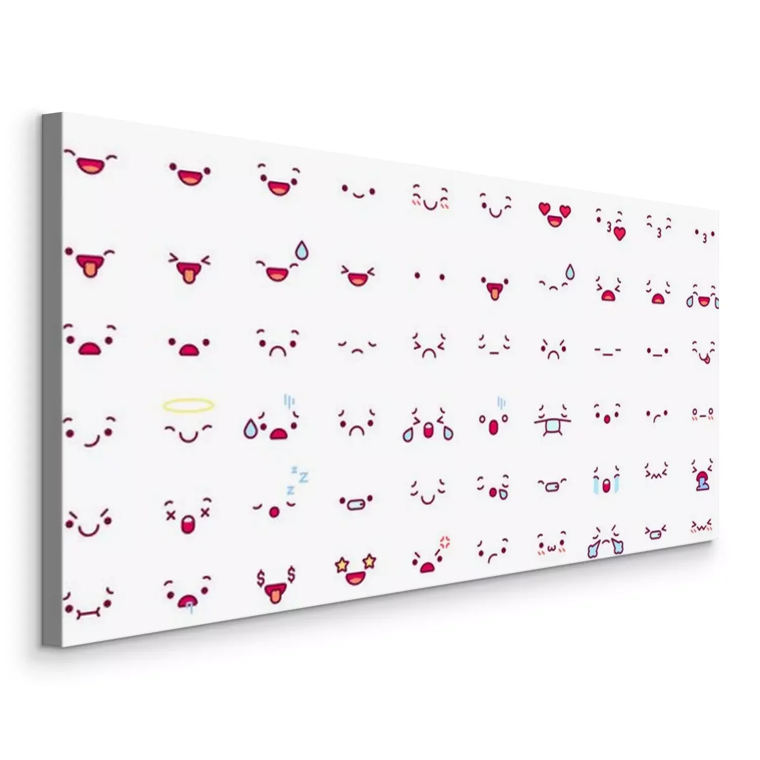 Canvas Cute emoticon emoji faces. Cartoon kawaii face expression in japanese anime character. Manga emotion kiss, cry and angry vector icons set. Happy and sad emotions, sleeping, ill, stressed