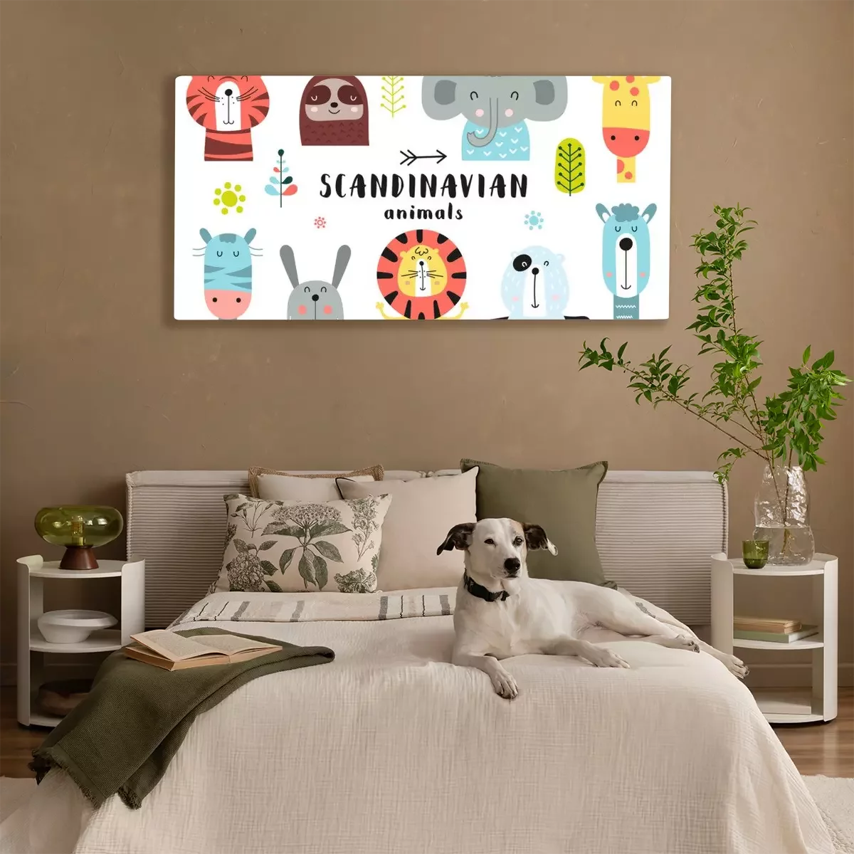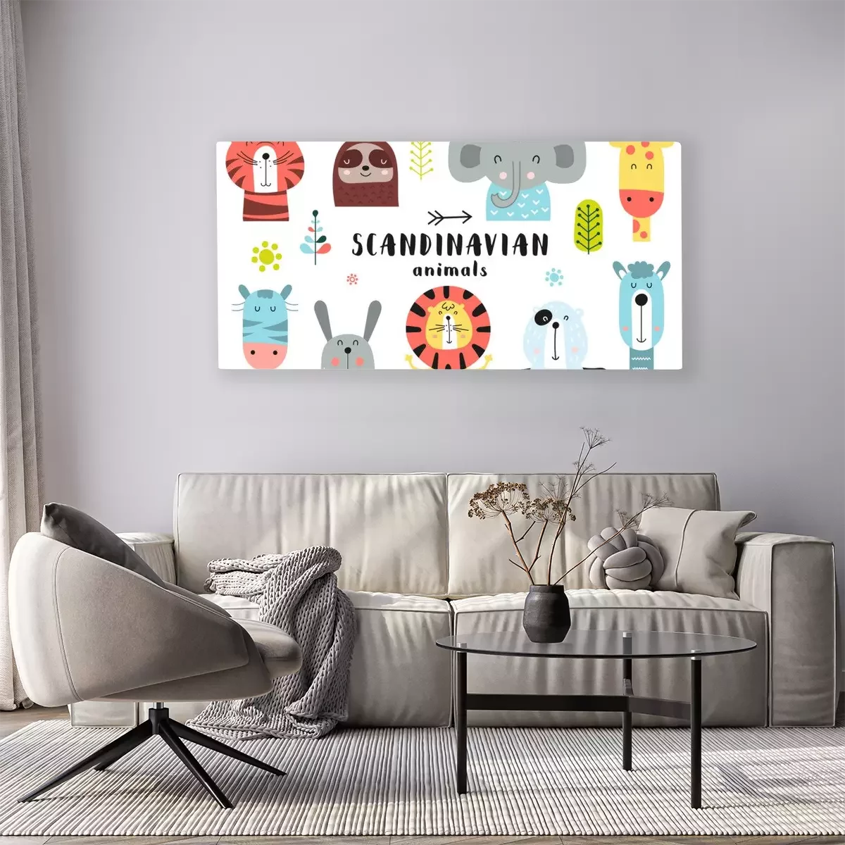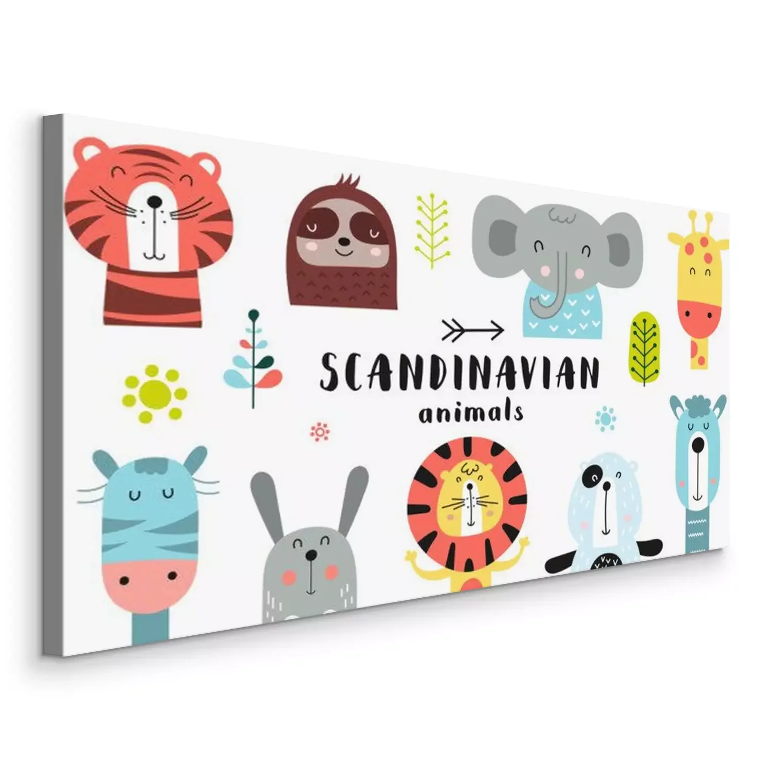 Canvas Cute scandinavian animals set. Hand drawn. Doodle cartoon animals for nursery posters, cards, kids t-shirts. Vector illustration. Tiger, lazy sloth, elephant, giraffe, zebra, hare, lion, bear, llama.