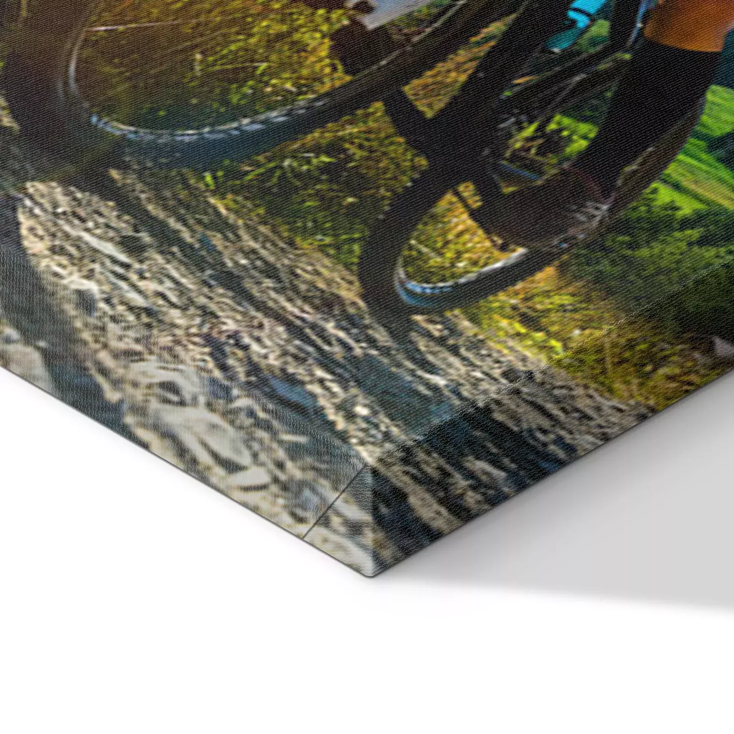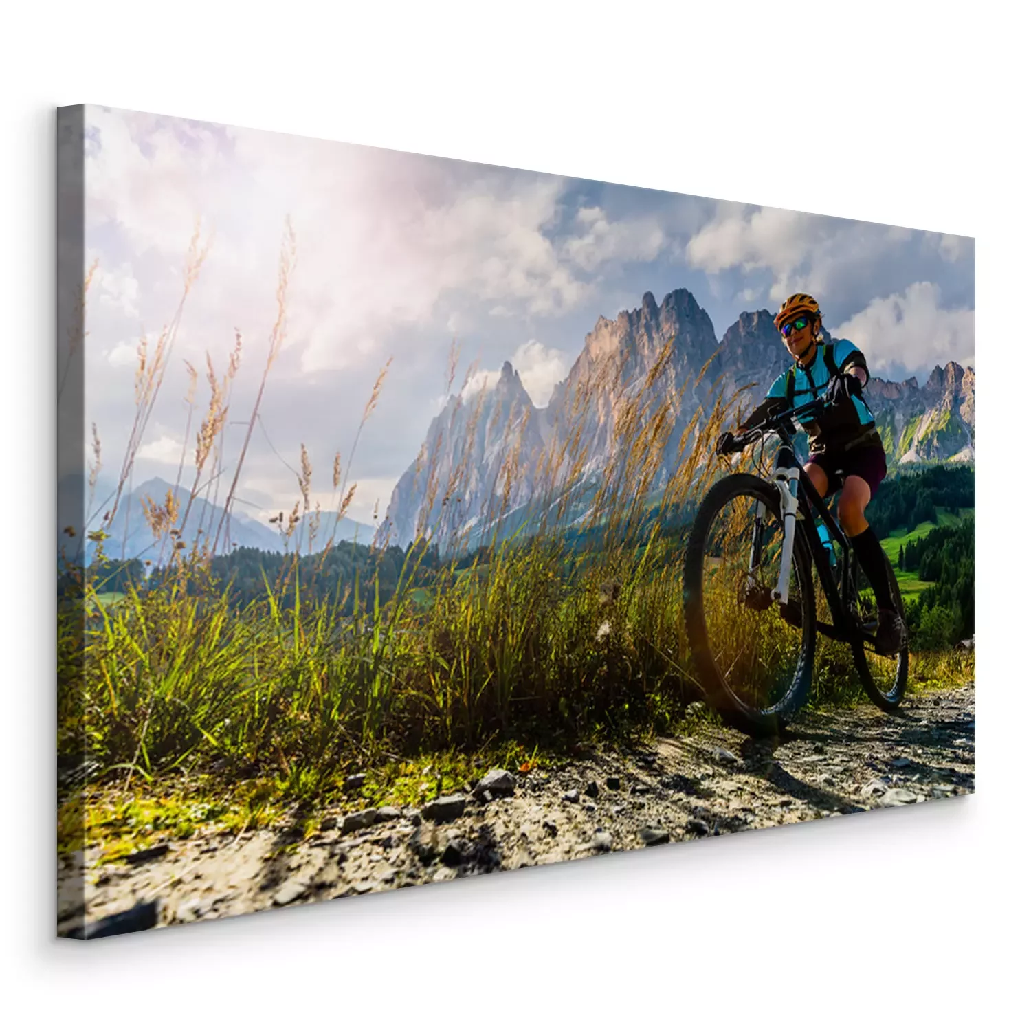 Canvas Cycling outdoor adventure in Dolomites. Cycling woman in Dolomites landscape. Woman cycling MTB enduro trail track. Outdoor sport activity.