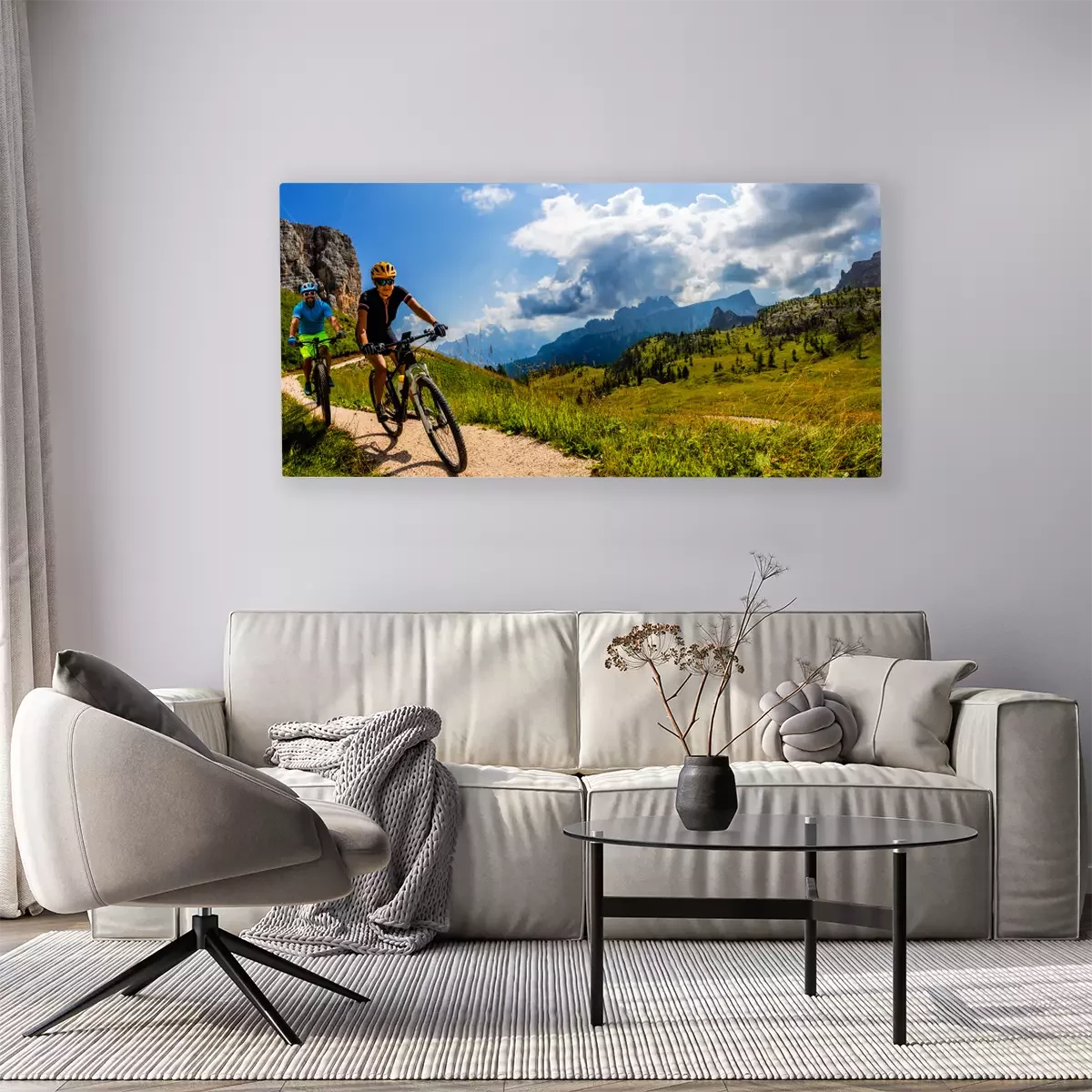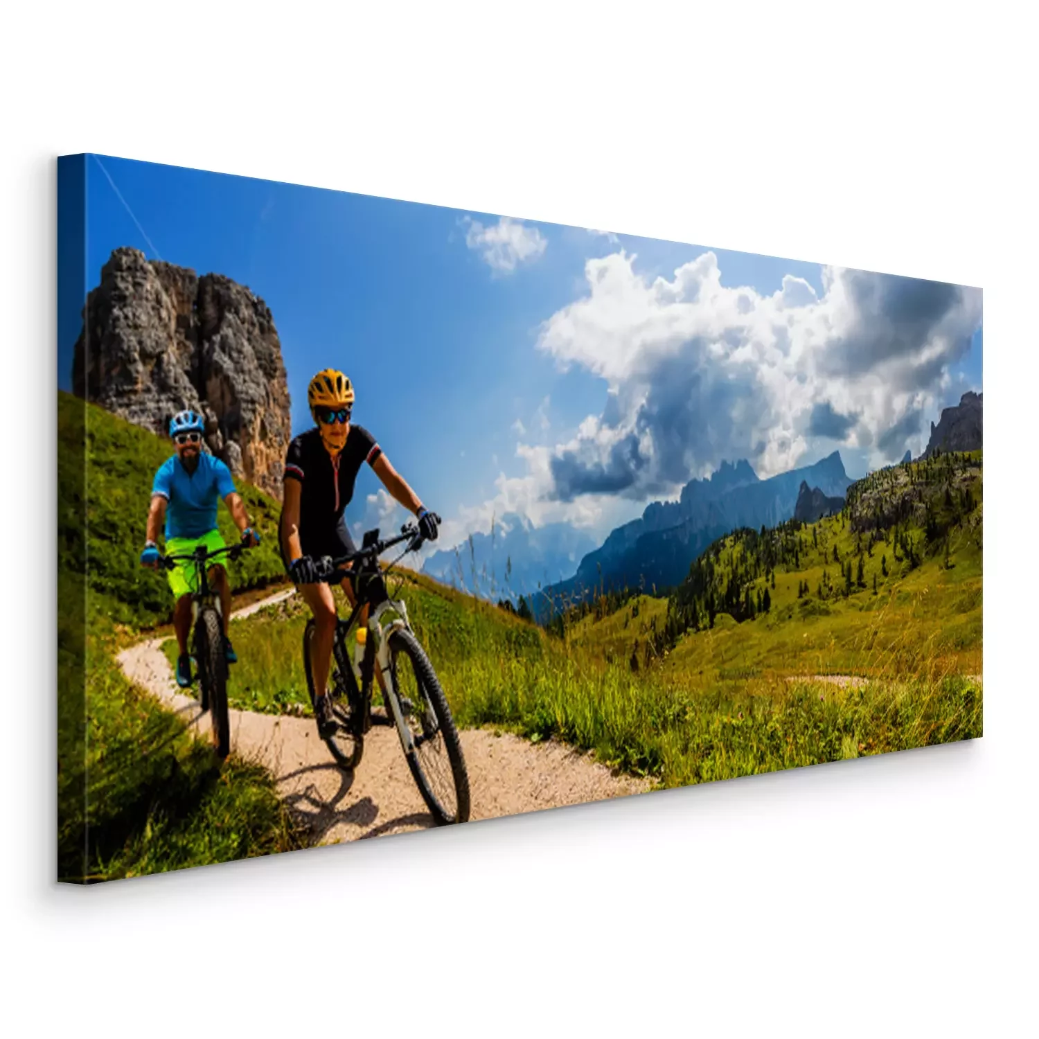 Canvas: Cycling woman and man riding on bikes in Dolomites mountains landscape. Couple cycling MTB enduro trail track. Outdoor sport activity.