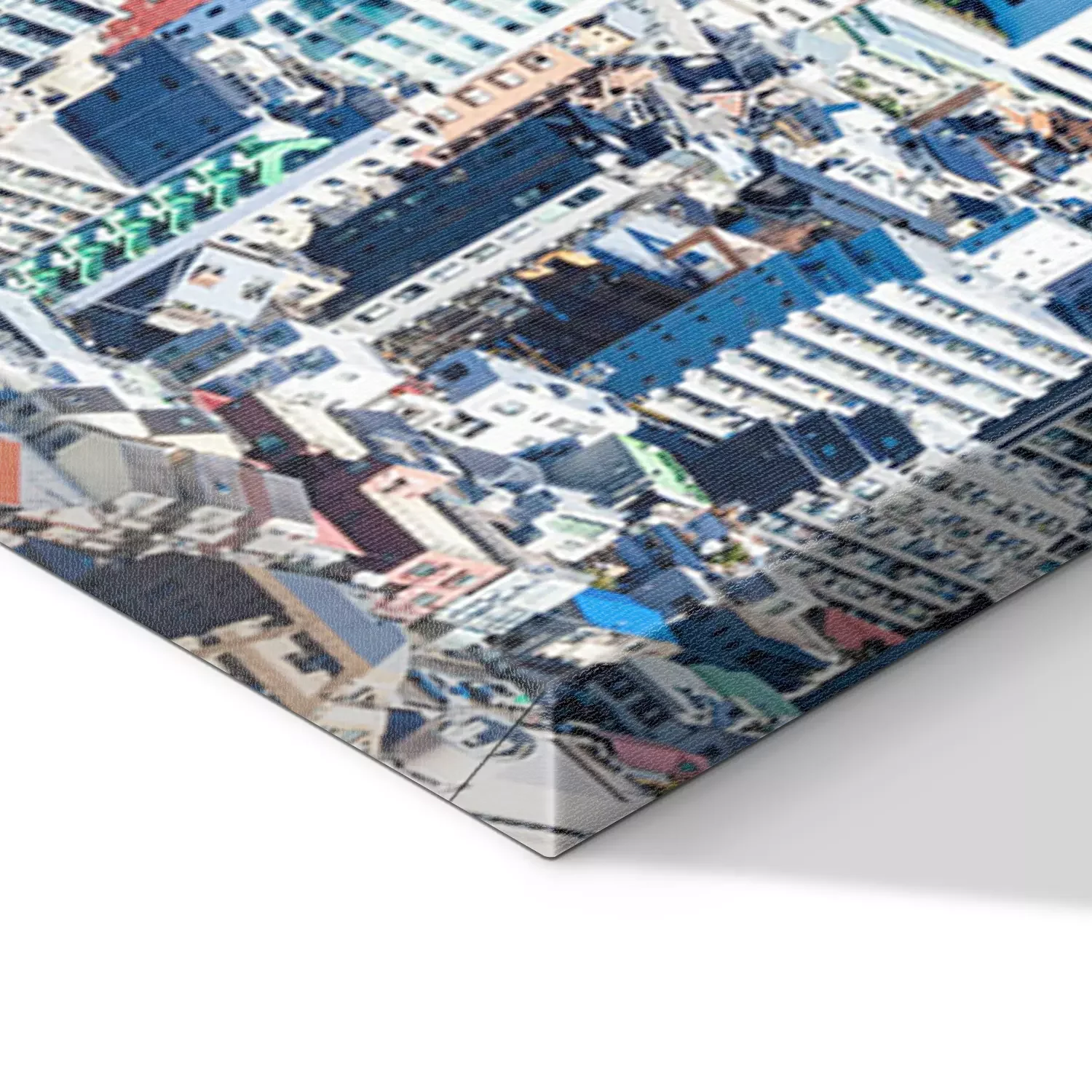 De print wordt aangebracht op hoogwaardig canvas dat op een schildersweefgetouw (spieraam) wordt gespannen. Omdat de print de zijranden bedekt, hoeft het ontwerp niet met een extra kader te worden omlijst. Wij raden ook composities aan die uit meerdere foto's bestaan en zo een coherente compositie vormen.