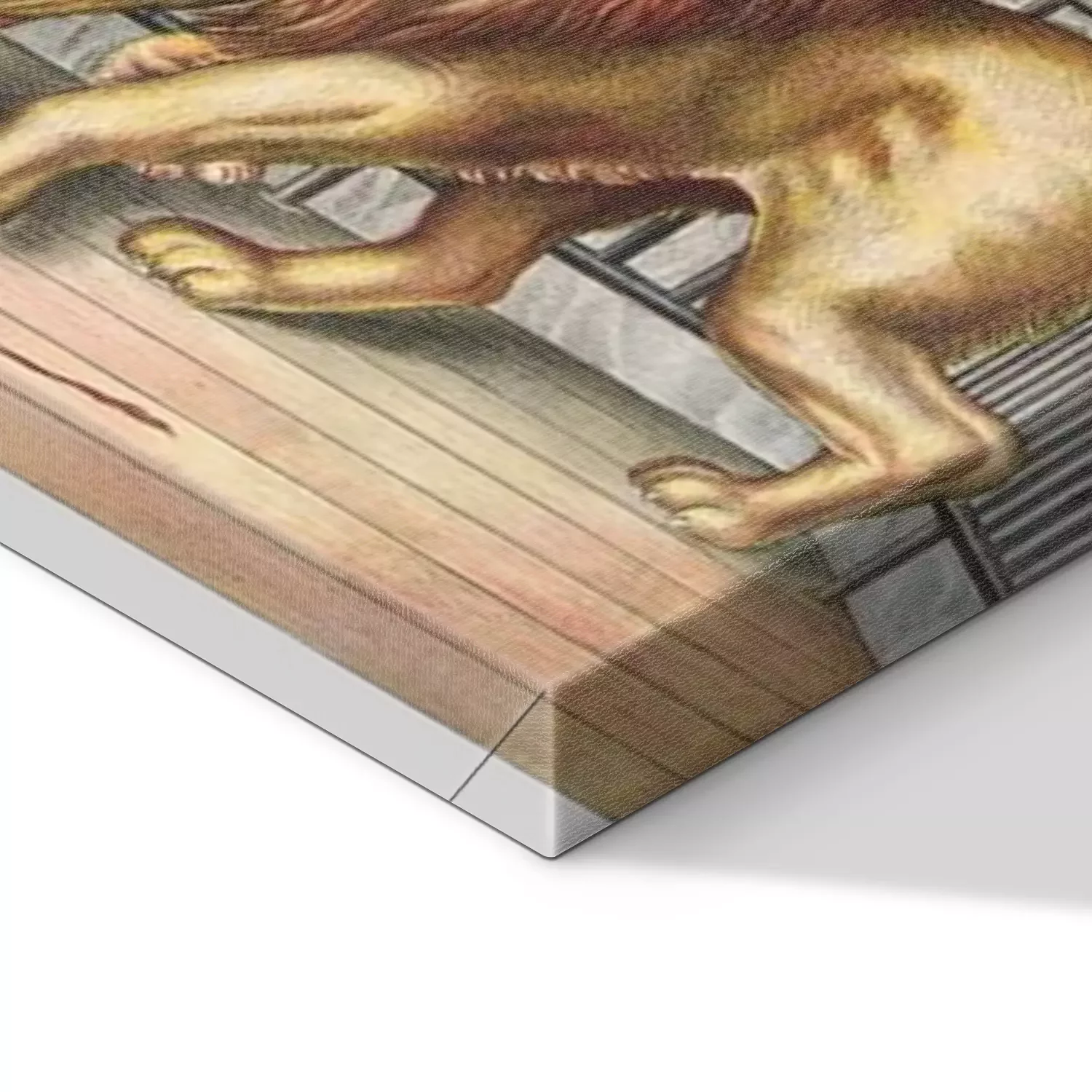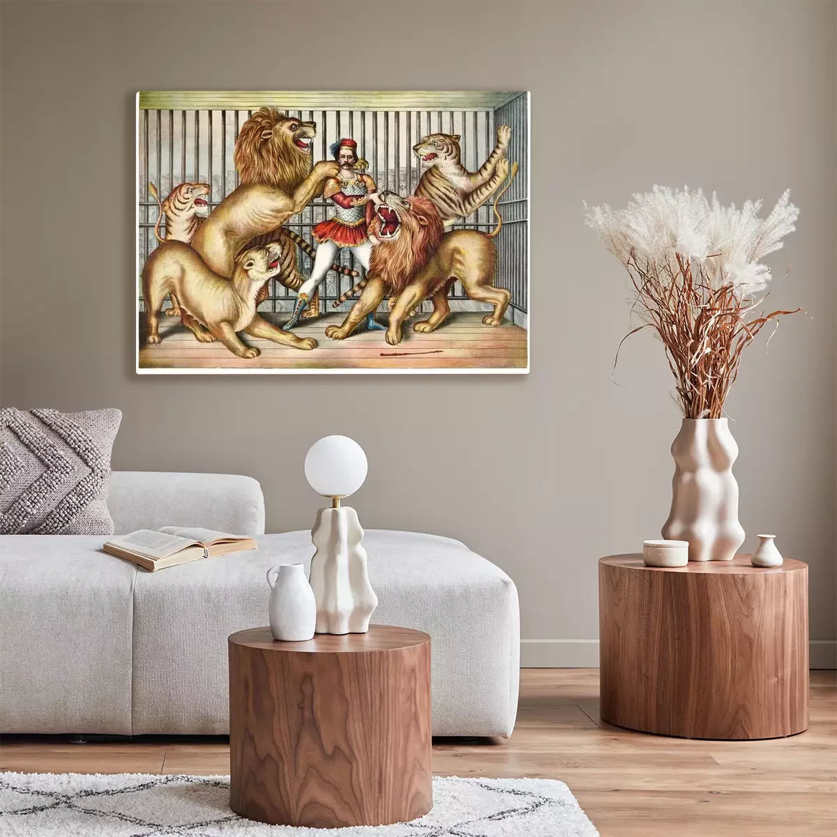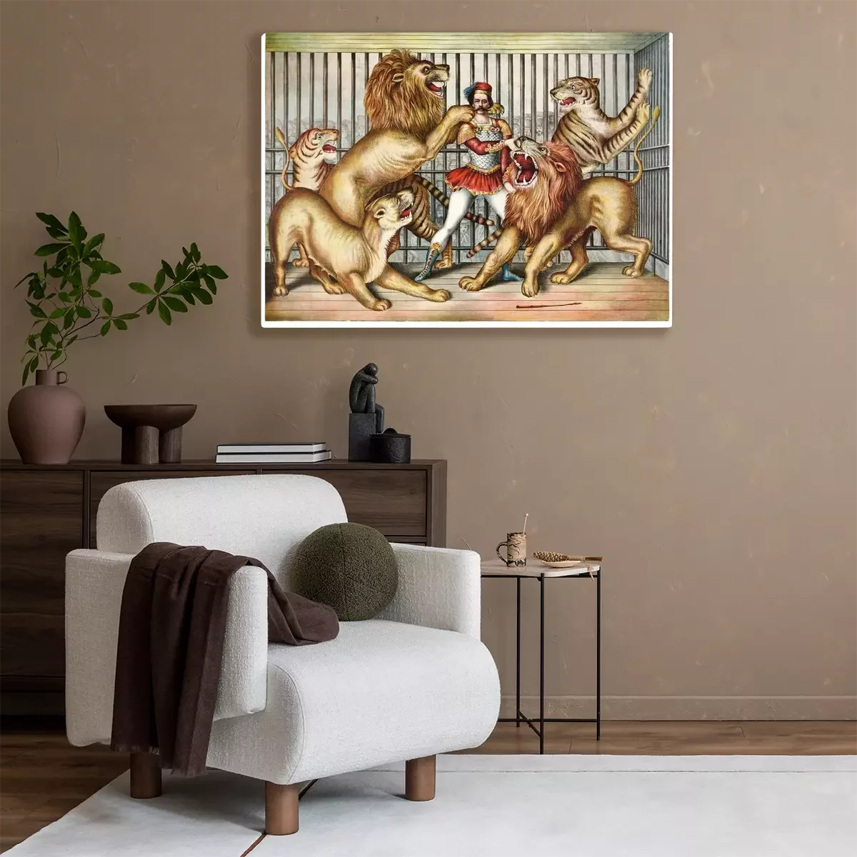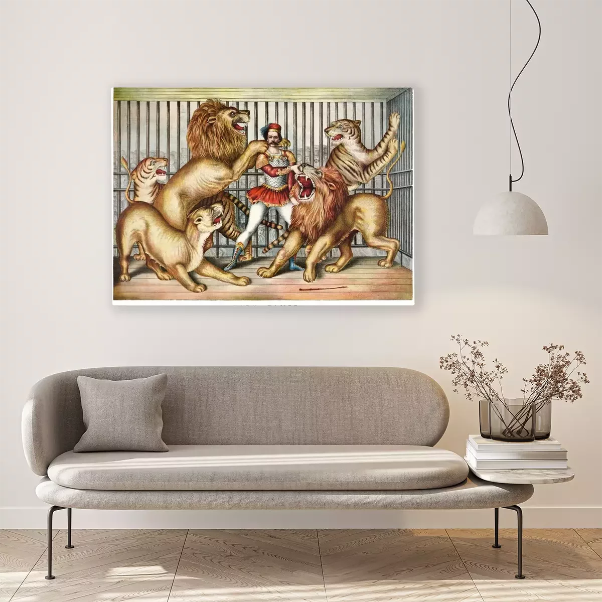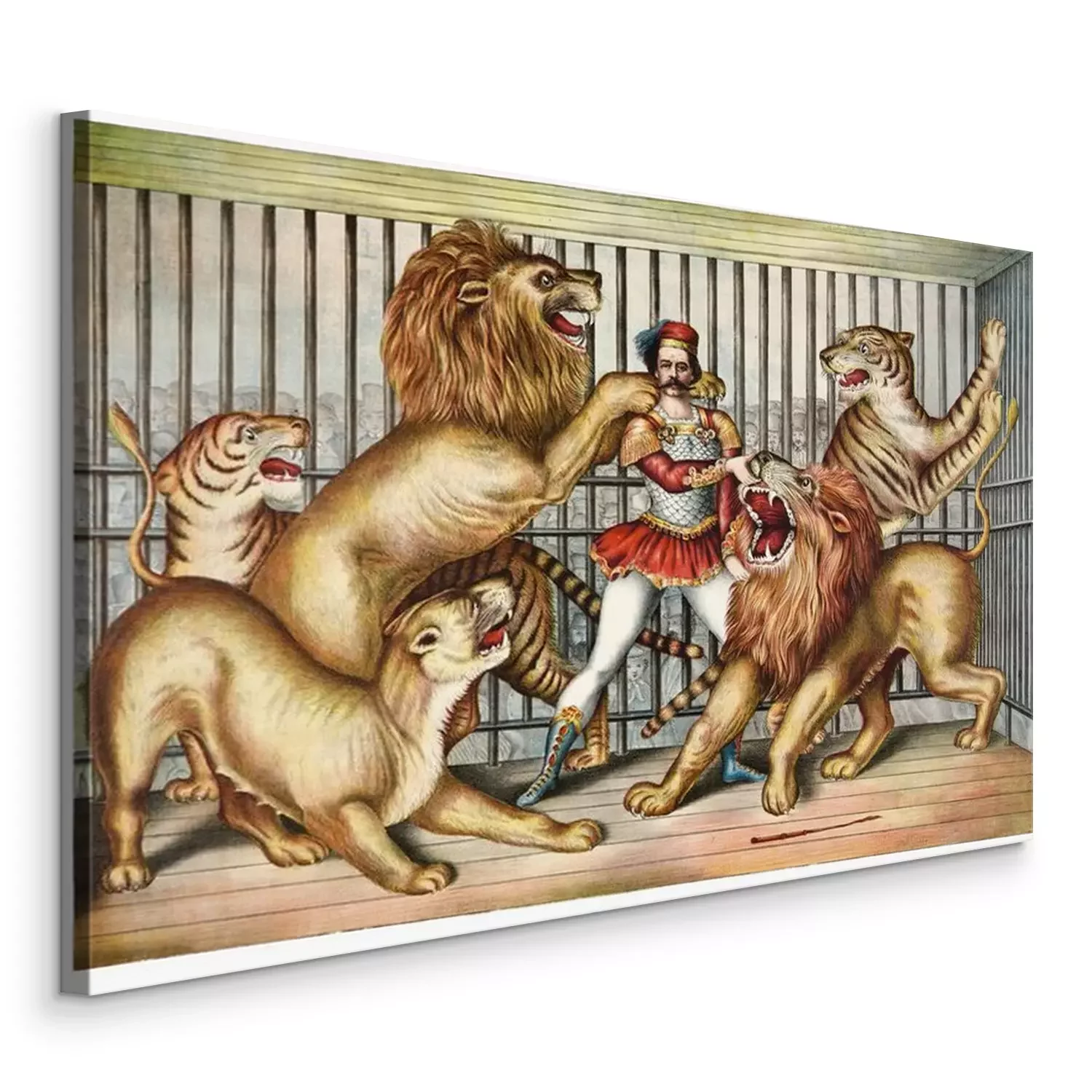 Canvas Dappere leeuwentemmer omringd door hongerige beesten in een kooi. Oude illustratie door niet-geïdentificeerde auteur, publ. in Cincinnati, 1873