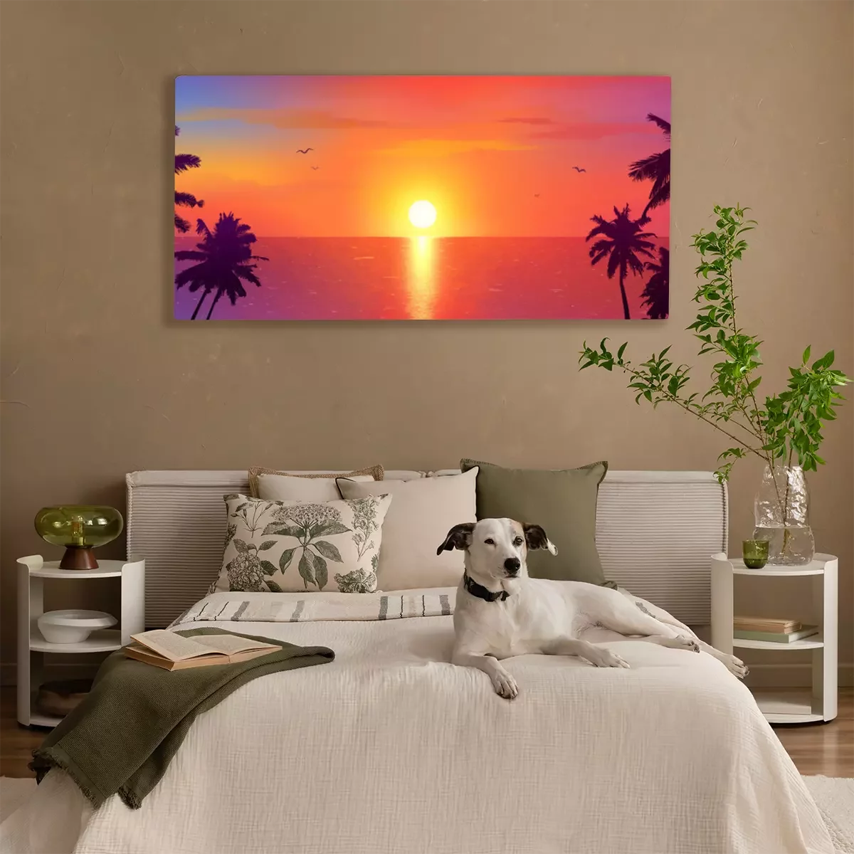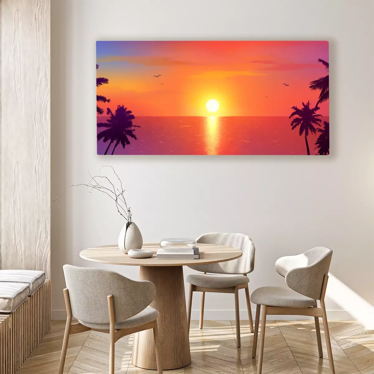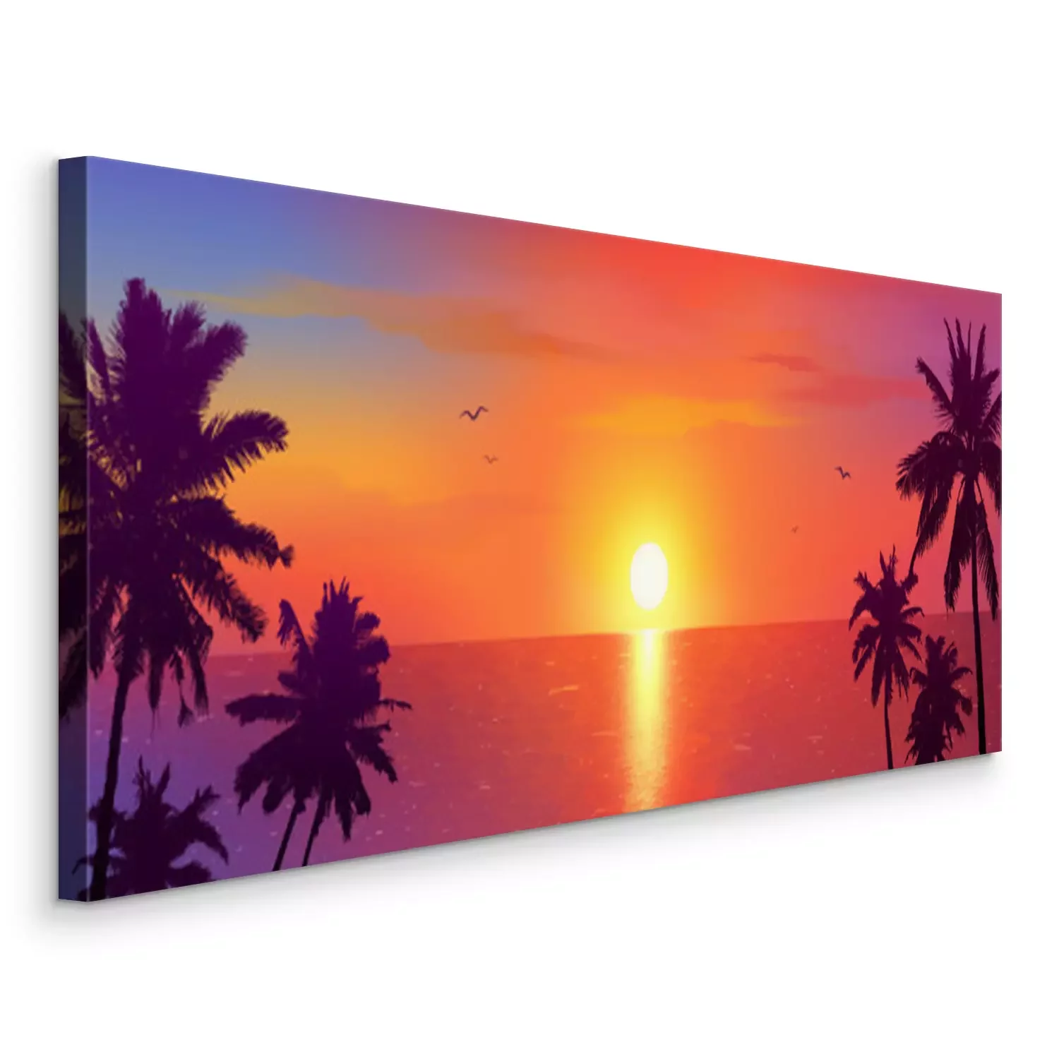 Canvas: Dark palm trees silhouettes on colorful tropical ocean sunset background, vector illustration