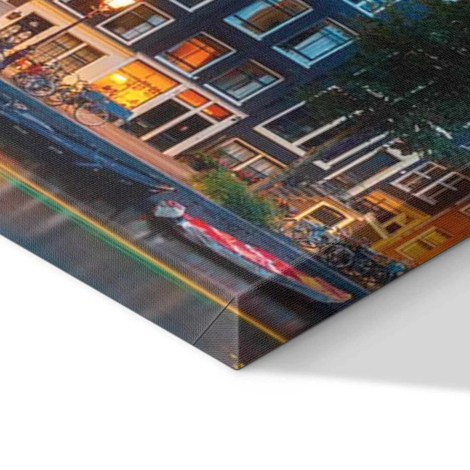 De print wordt aangebracht op hoogwaardig canvas dat op een schildersweefgetouw (spieraam) wordt gespannen. Omdat de print de zijranden bedekt, hoeft het ontwerp niet met een extra kader te worden omlijst. Wij raden ook composities aan die uit meerdere foto's bestaan en zo een coherente compositie vormen.