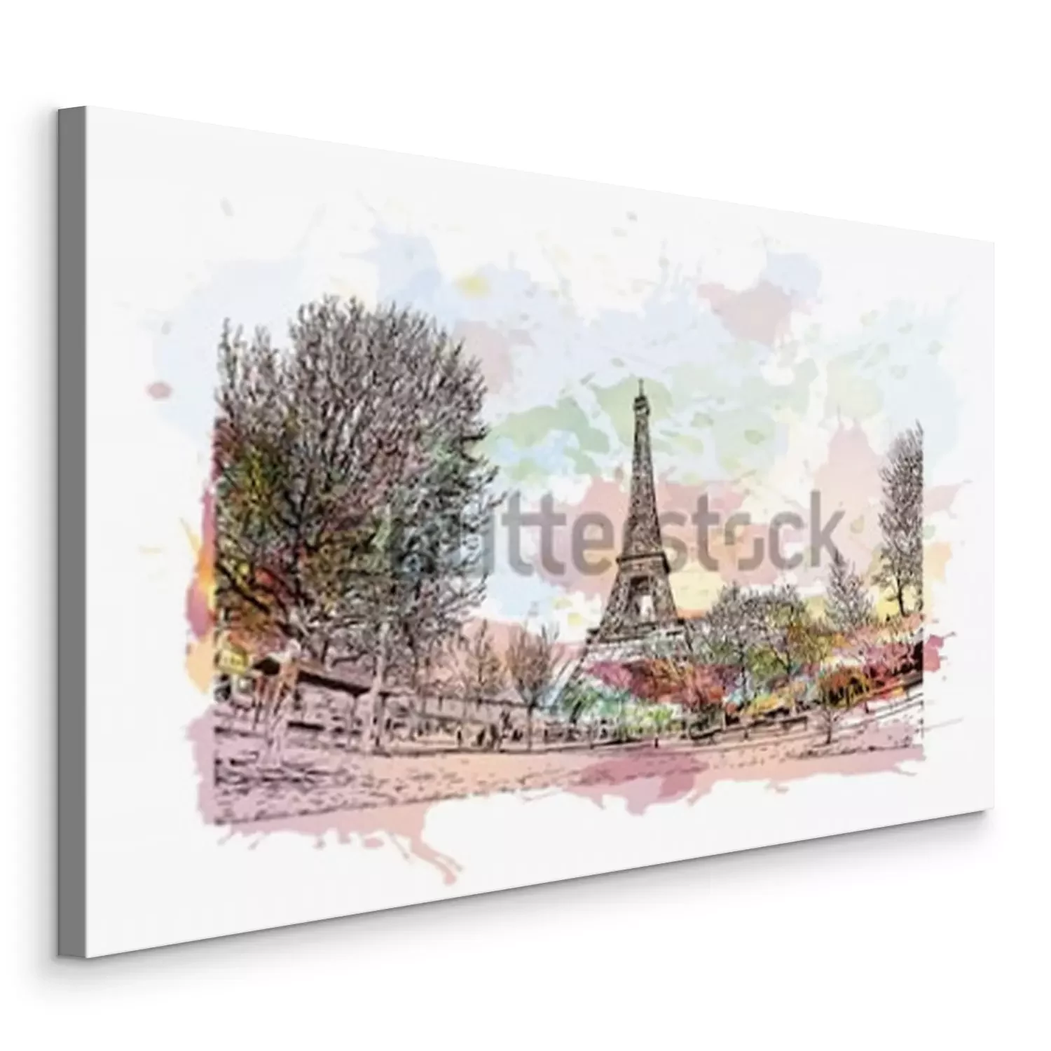 Canvas: De Eiffeltoren is een smeedijzeren roostertoren op de Champ de Mars in Parijs, Frankrijk. Waterverfplons met Hand getrokken schetsillustratie in vector.
