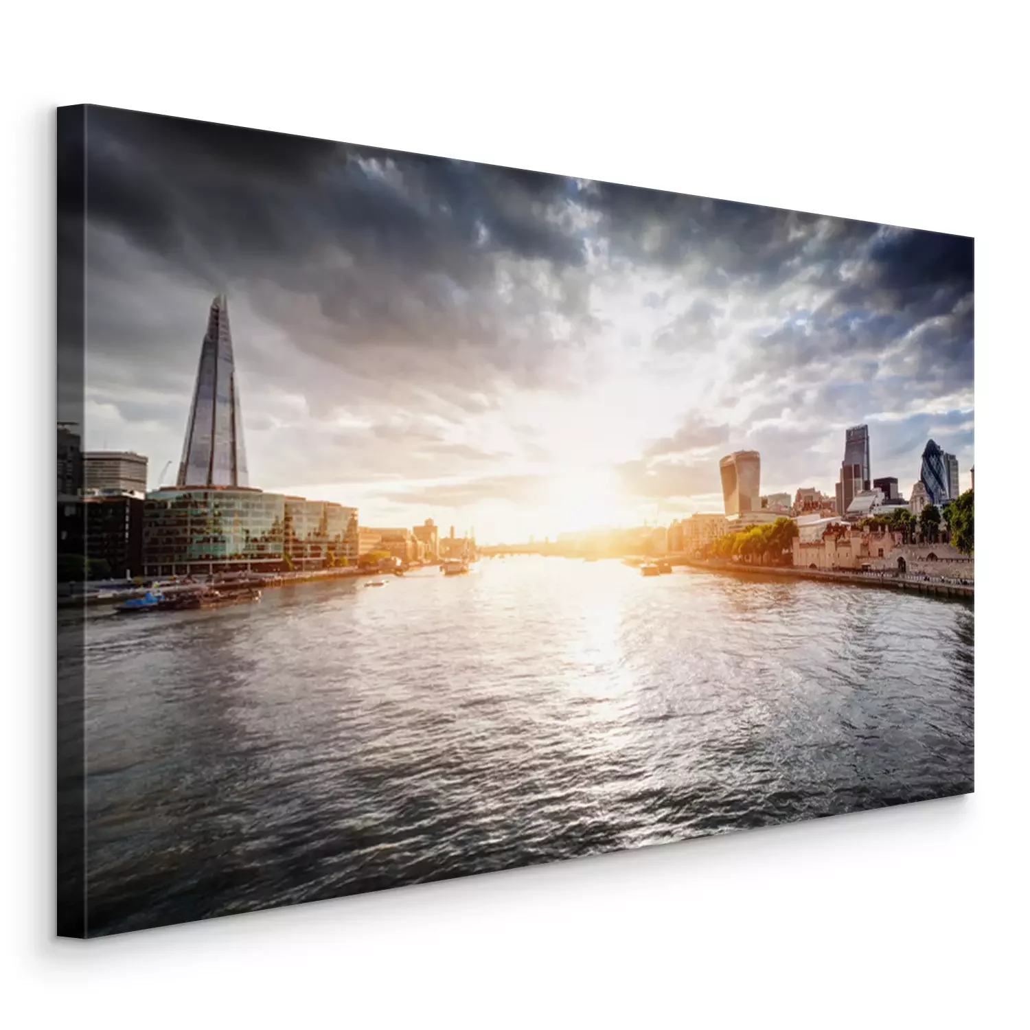 Canvas: De horizon van Londen bij zonsondergang, Engeland het Verenigd Koninkrijk. Rivier de Theems, de Shard, City Hall.