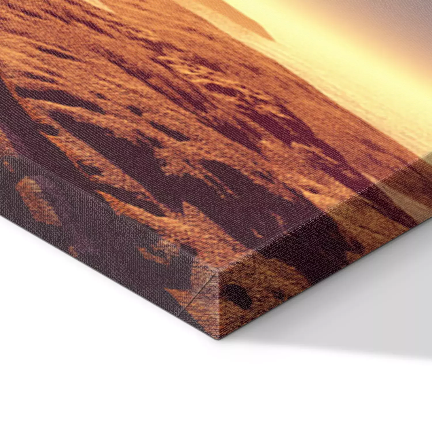 De print wordt aangebracht op hoogwaardig canvas dat op een schildersweefgetouw (spieraam) wordt gespannen. Omdat de print de zijranden bedekt, hoeft het ontwerp niet met een extra kader te worden omlijst. Wij raden ook composities aan die uit meerdere foto's bestaan en zo een coherente compositie vormen.