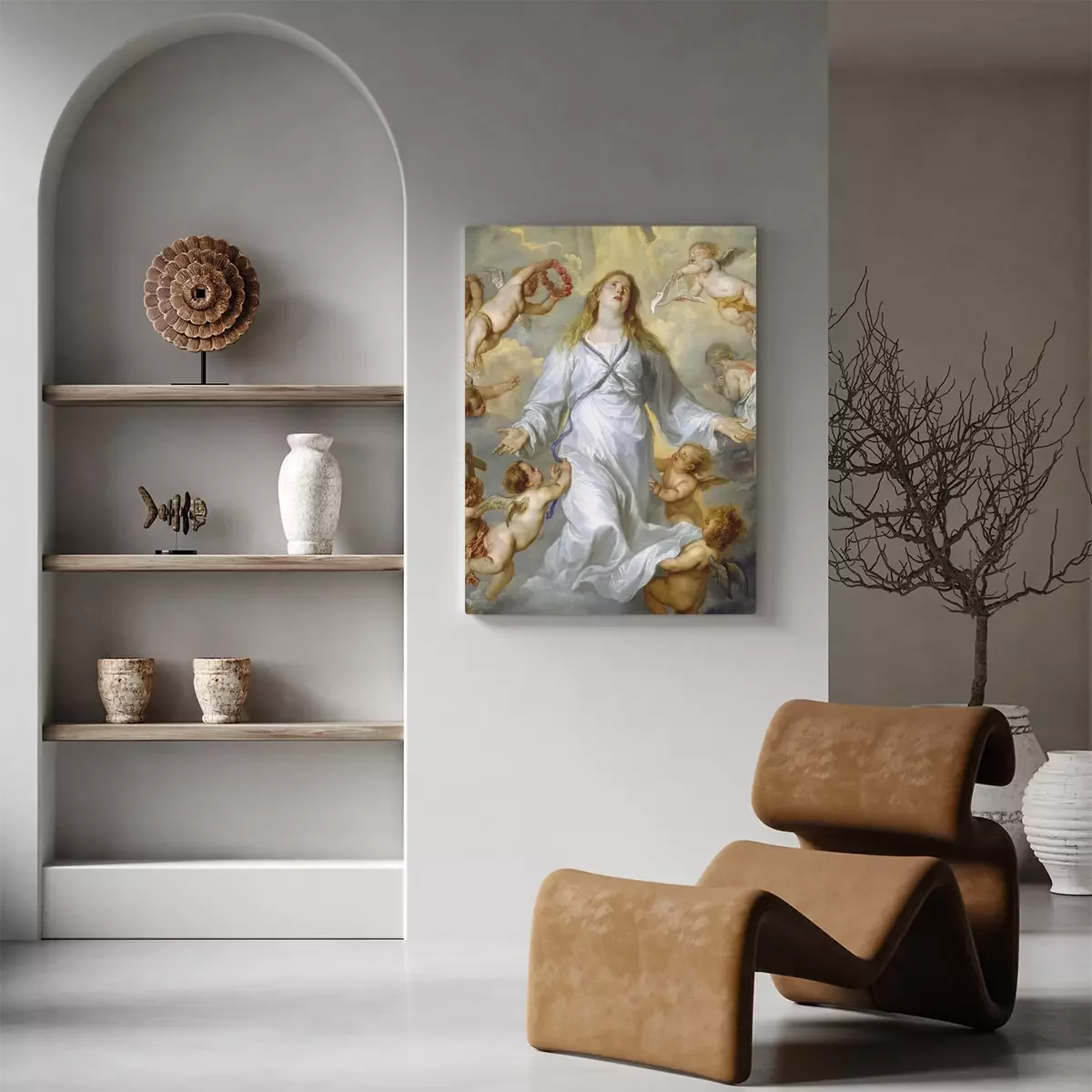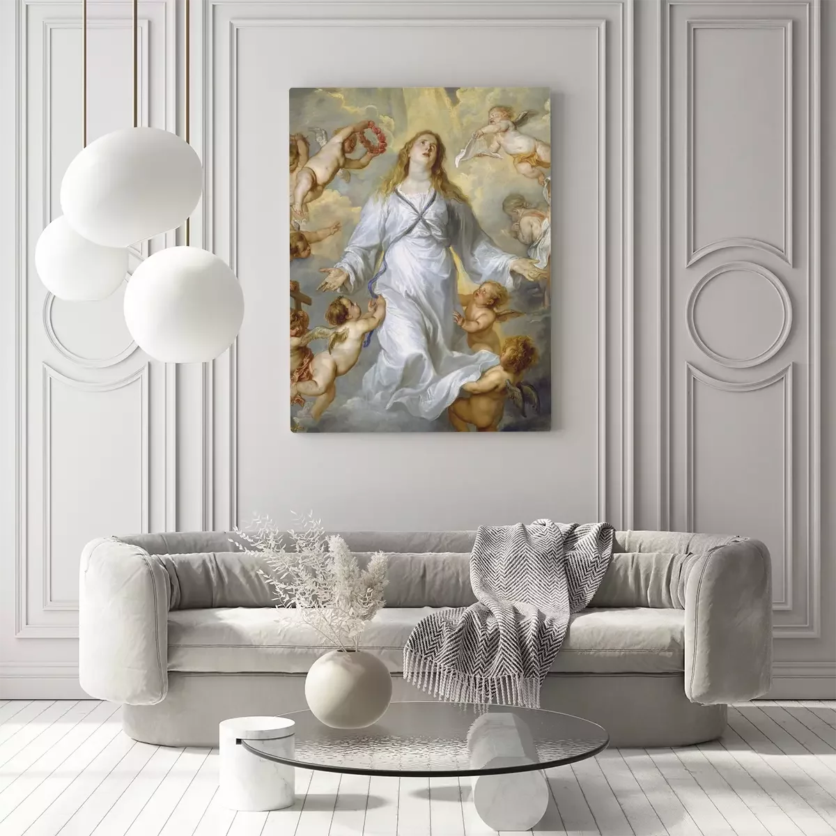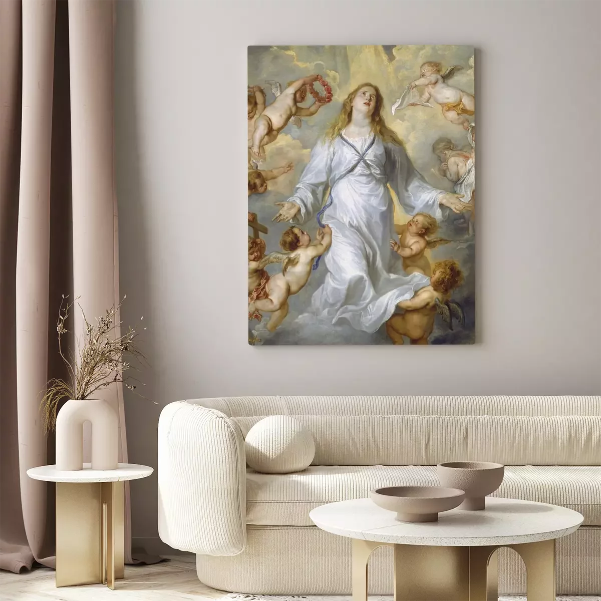 De maagd maria omringd door engelachtige figuren