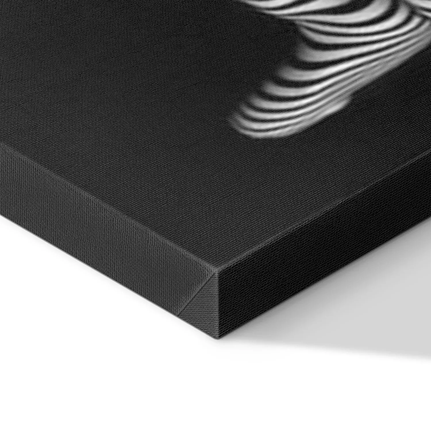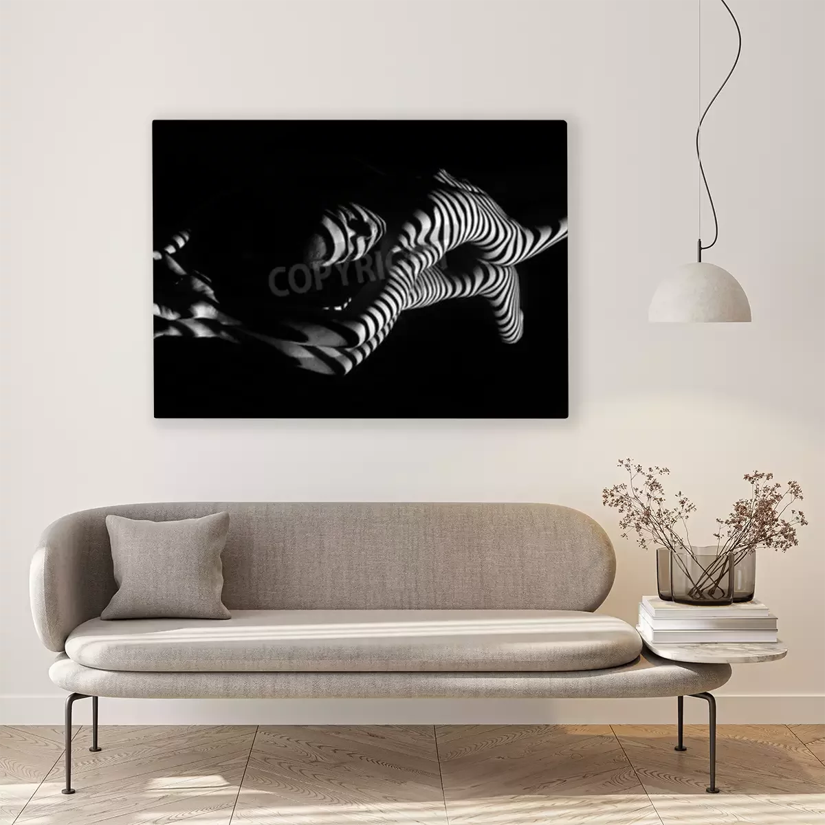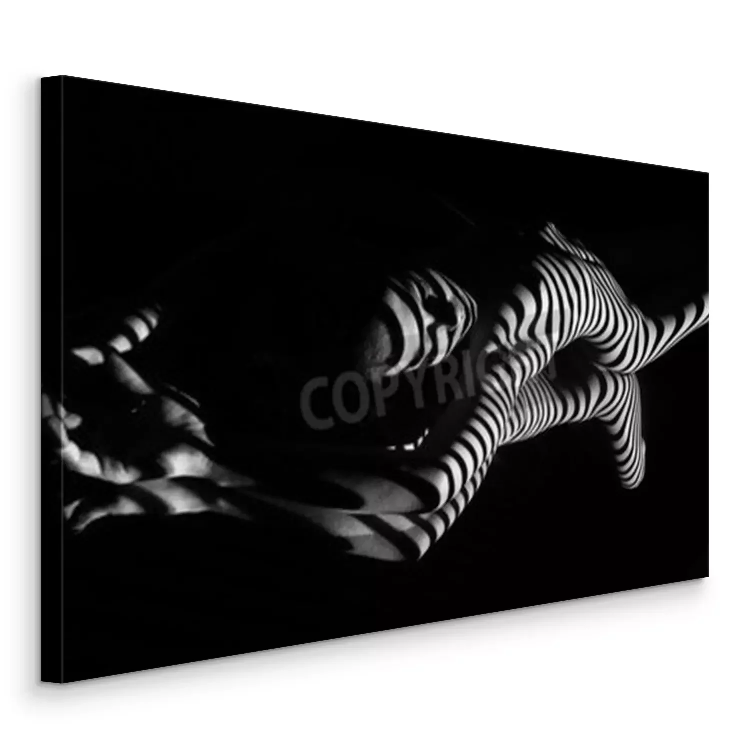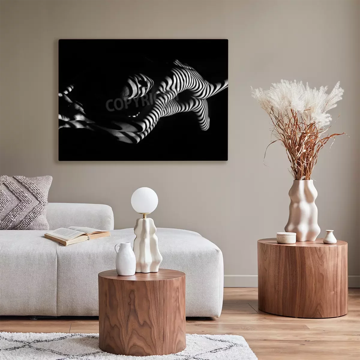 Canvas De naakt vrouw en haar reflectie met zwart-witte gestreepte strepen. Zwart-wit foto gemaakt met de projector