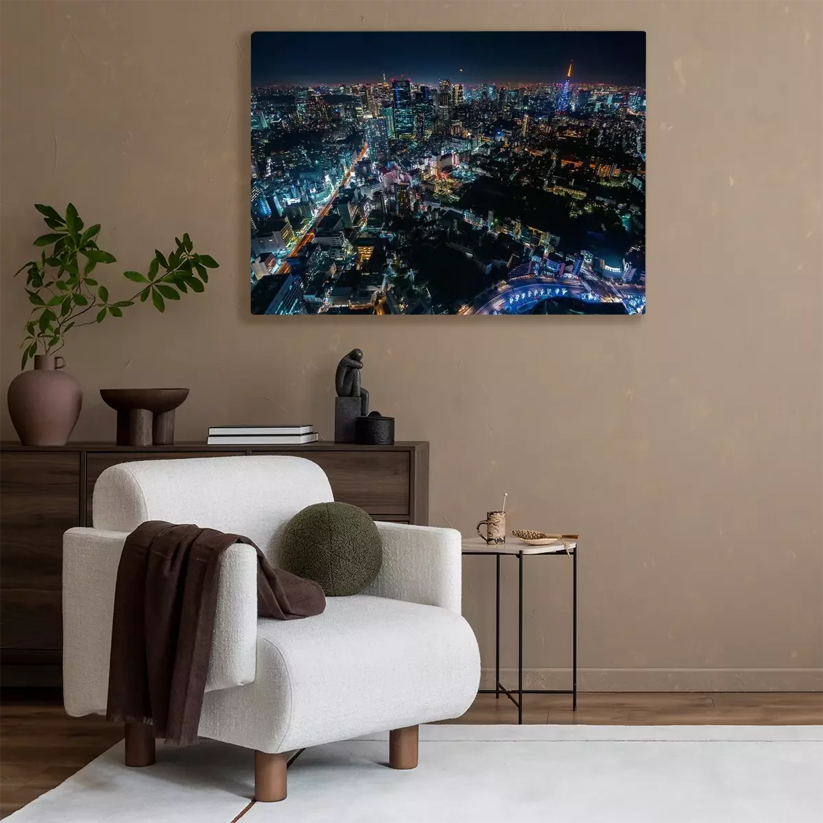 Aerial view of the Osaka skyline at night through a skyscraper window