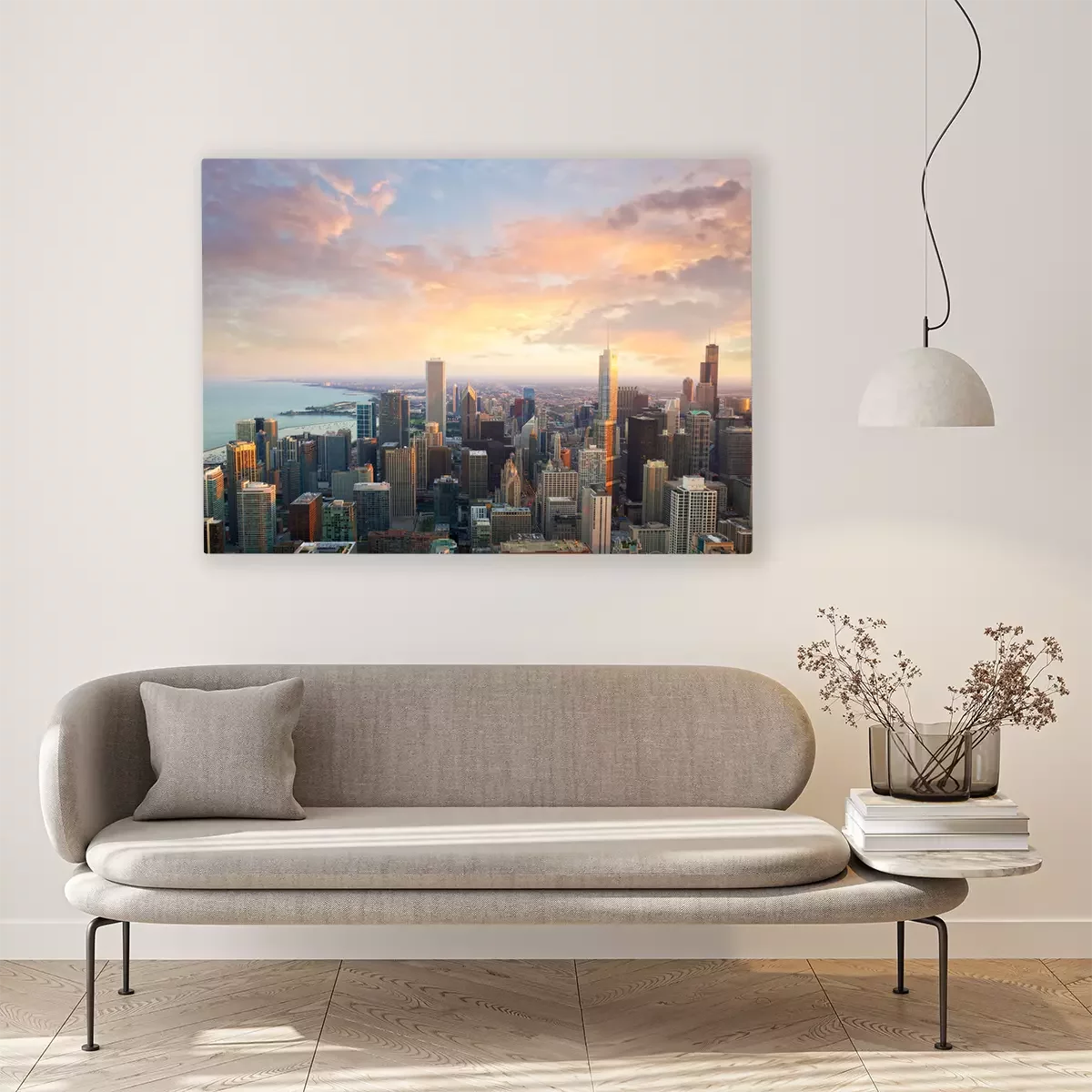 Aerial Chicago panorama bij zonsondergang, IL, USA
