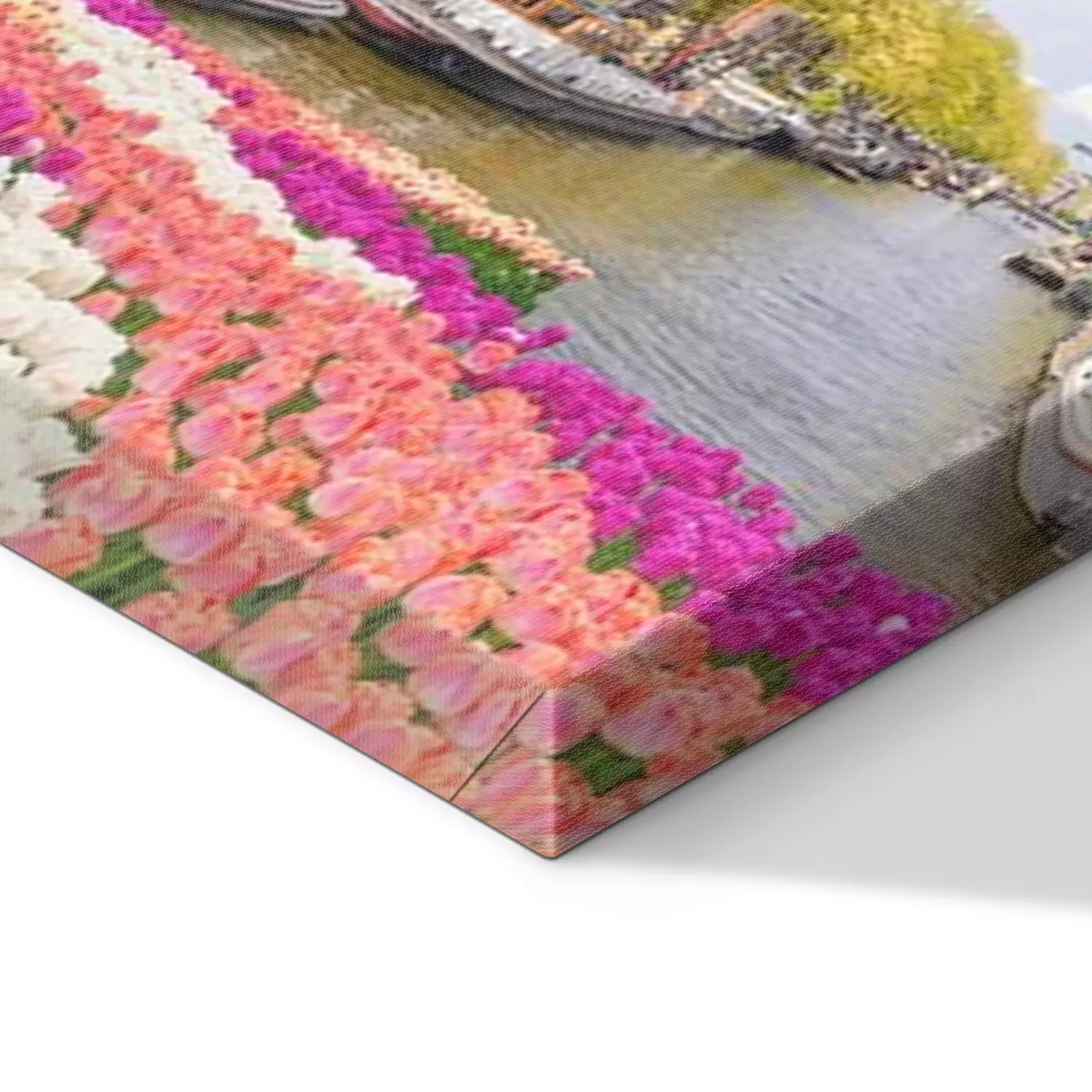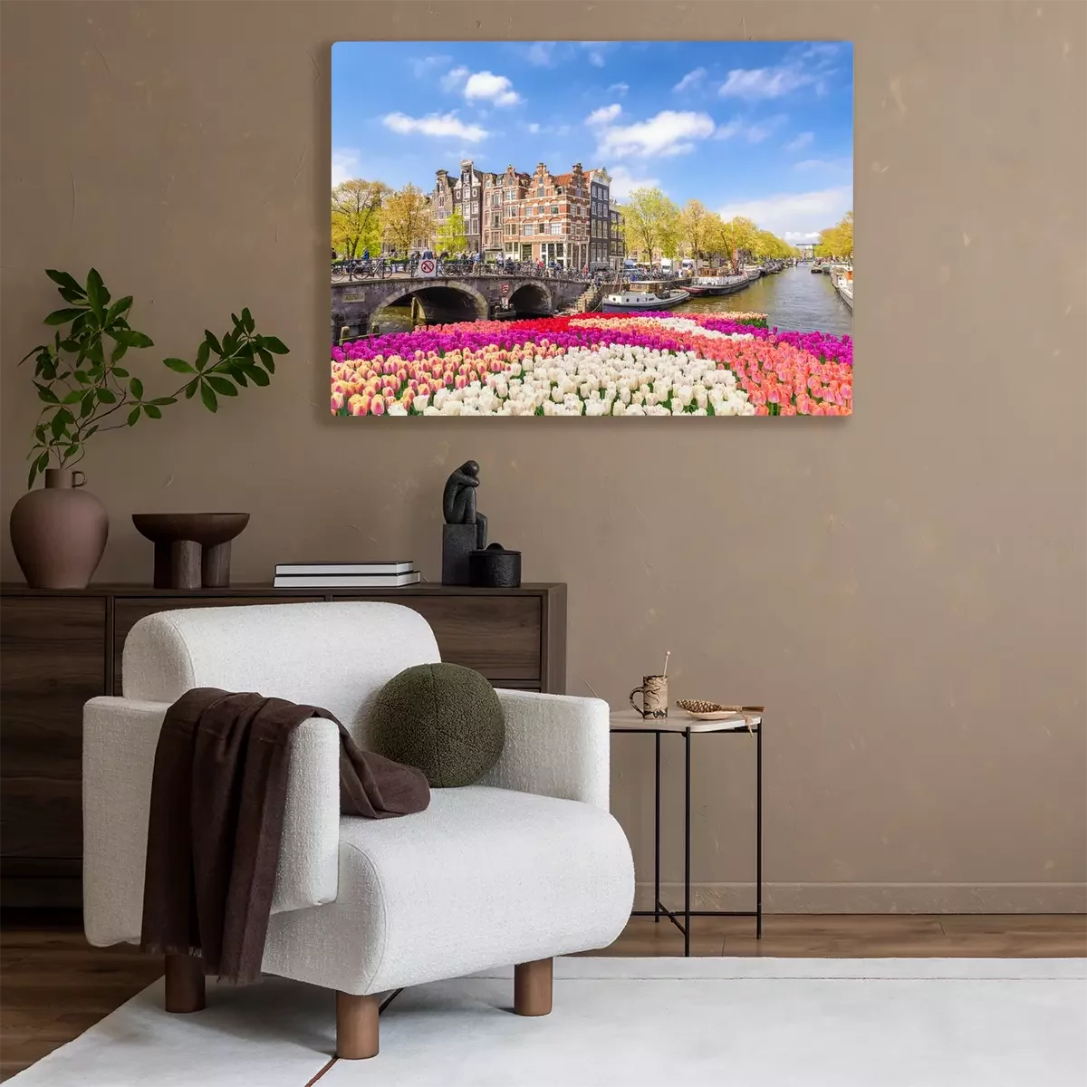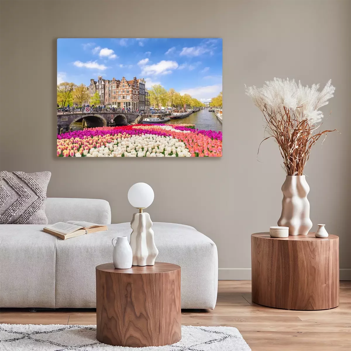 Canvas: De stadshorizon van Amsterdam bij kanaalwaterkant met de bloem van de de lentetulp, Amsterdam, Nederland