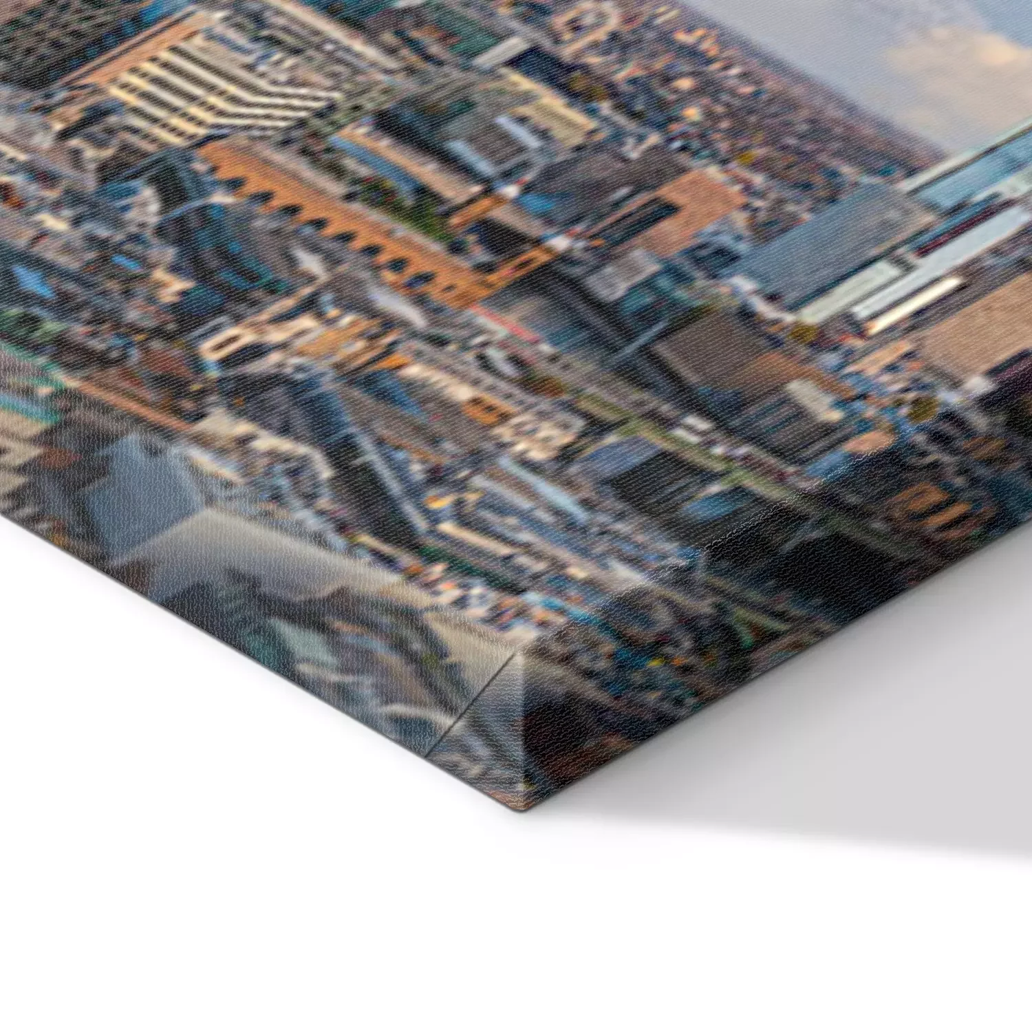De print wordt aangebracht op hoogwaardig canvas dat op een schildersweefgetouw (spieraam) wordt gespannen. Omdat de print de zijranden bedekt, hoeft het ontwerp niet met een extra kader te worden omlijst. Wij raden ook composities aan die uit meerdere foto's bestaan en zo een coherente compositie vormen.