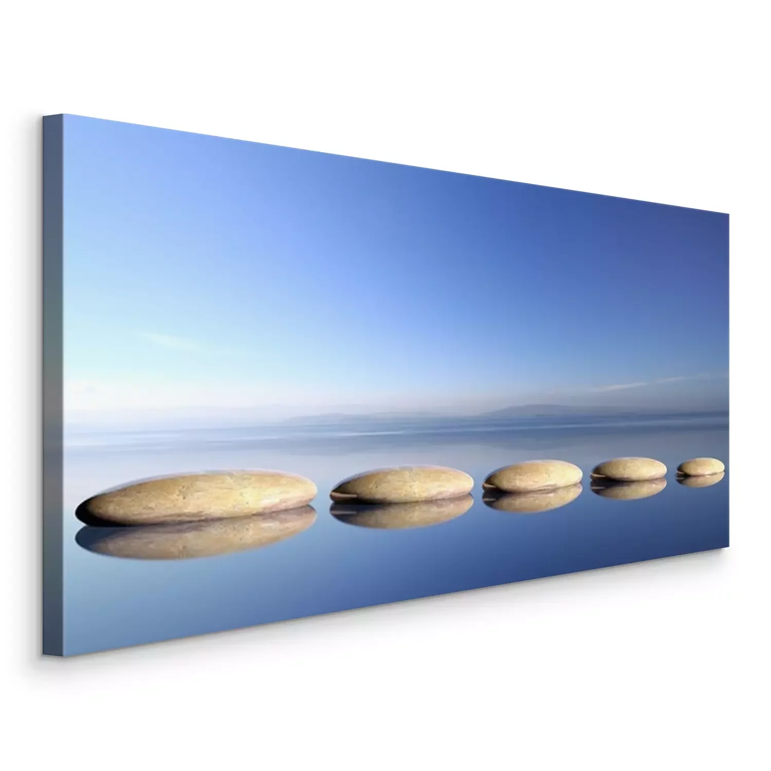 Canvas: De stenen van Zen rij van groot naar klein in water met blauwe hemel en rustige landschap achtergrond.