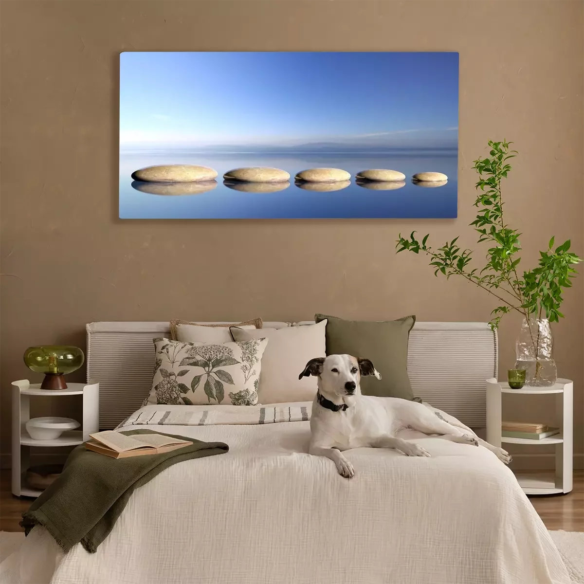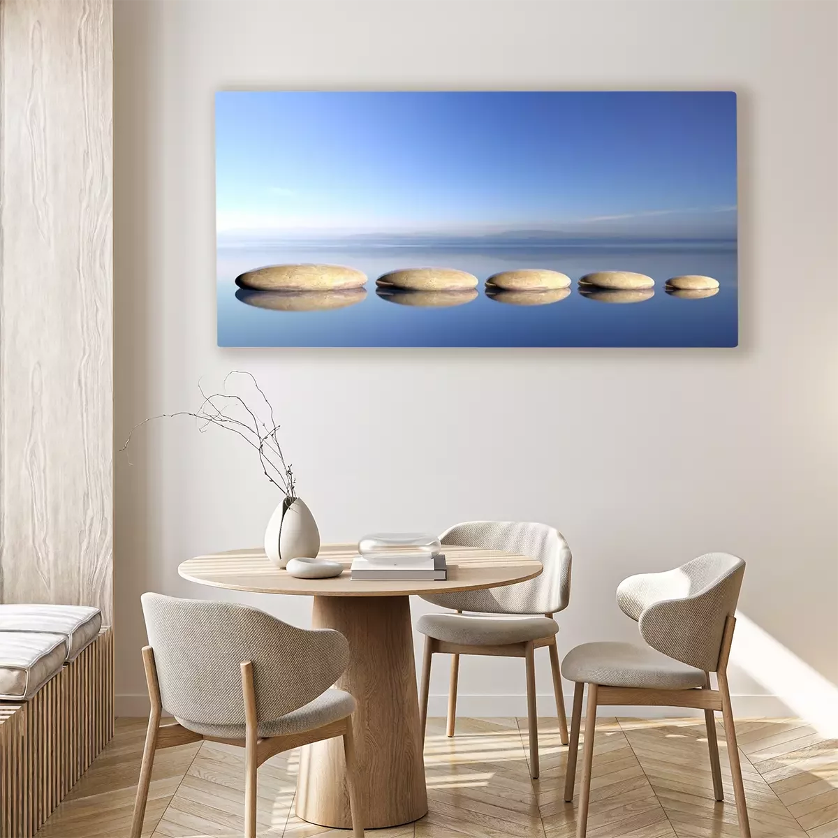 Canvas De stenen van Zen rij van groot naar klein in water met blauwe hemel en rustige landschap achtergrond.