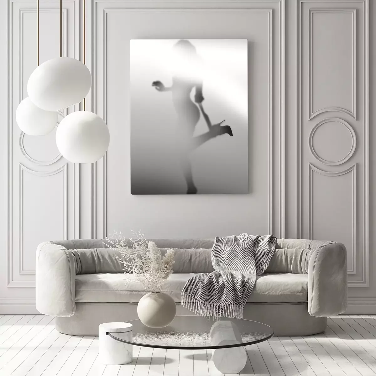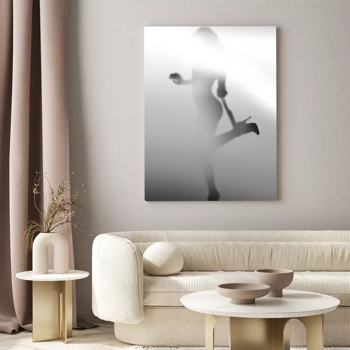 De verlichte omtrek van een vrouw tegen een mistige achtergrond