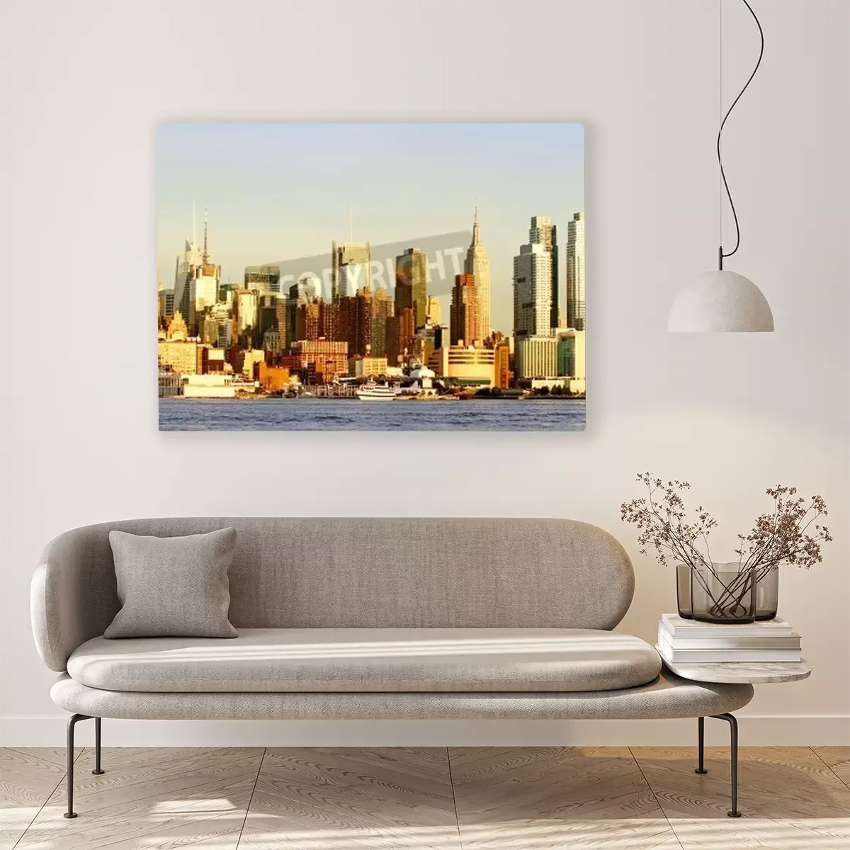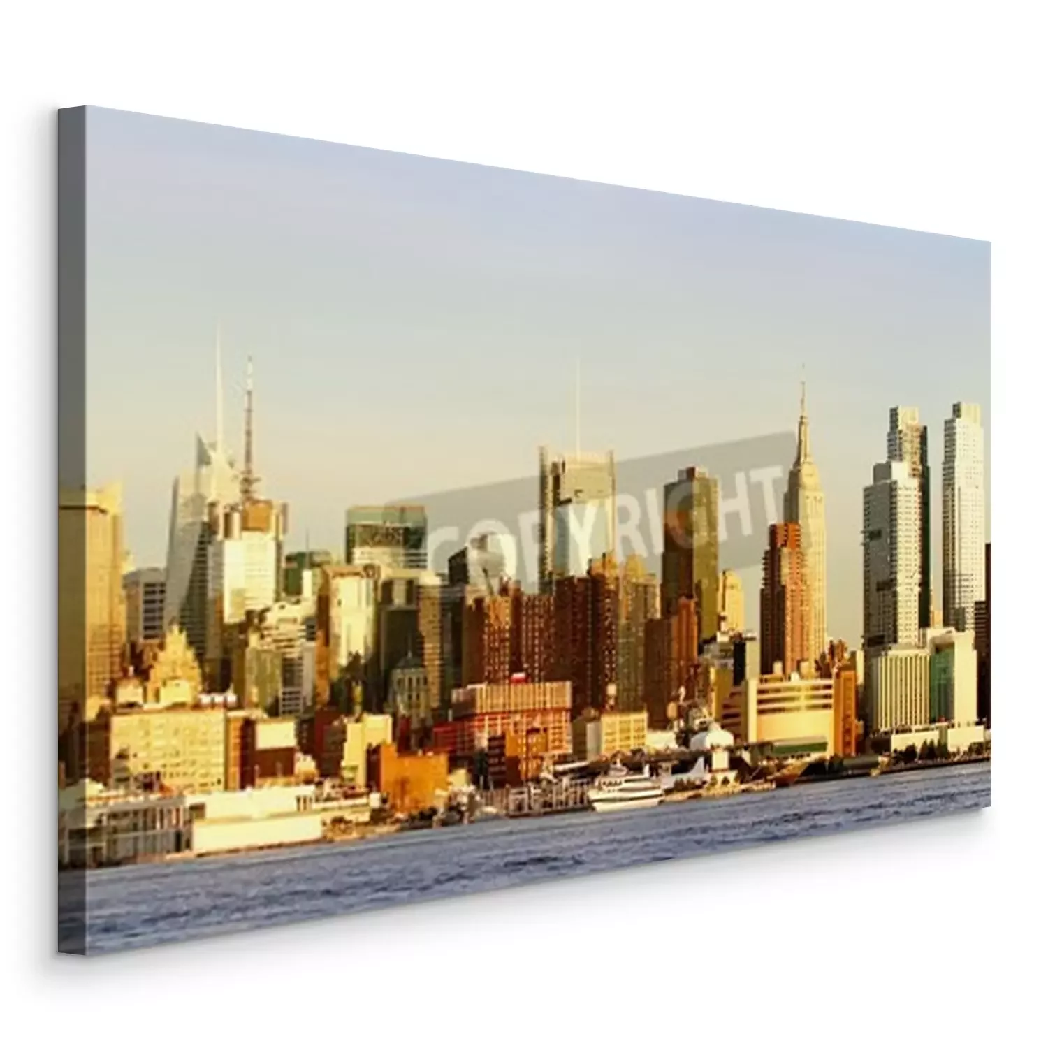 Canvas De wolkenkrabbers van Manhattan bij zonsondergang van New Jercey kant