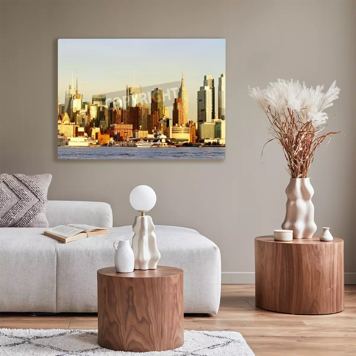 Canvas: De wolkenkrabbers van Manhattan bij zonsondergang van New Jercey kant