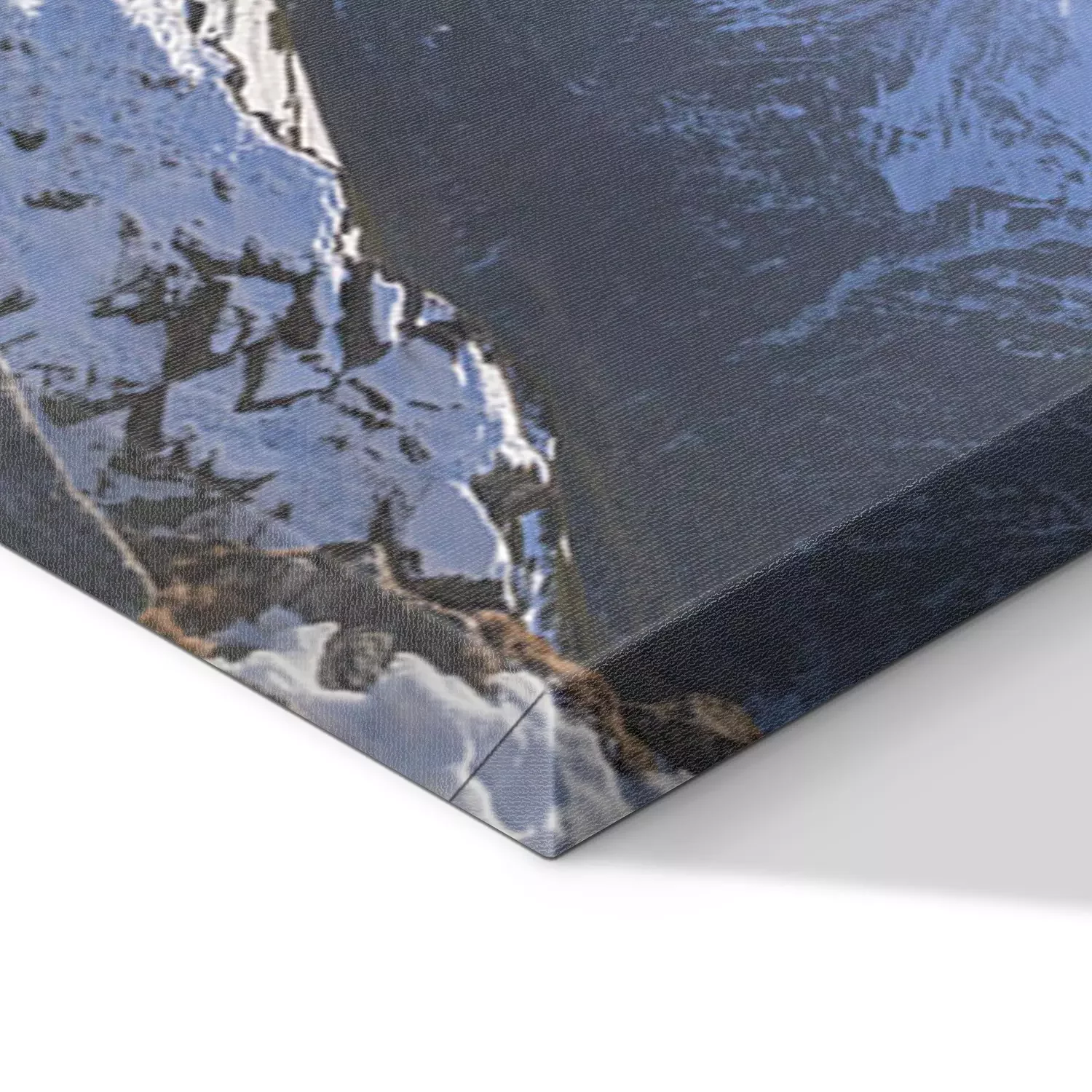 De print wordt aangebracht op hoogwaardig canvas dat op een schildersweefgetouw (spieraam) wordt gespannen. Omdat de print de zijranden bedekt, hoeft het ontwerp niet met een extra kader te worden omlijst. Wij raden ook composities aan die uit meerdere foto's bestaan en zo een coherente compositie vormen.