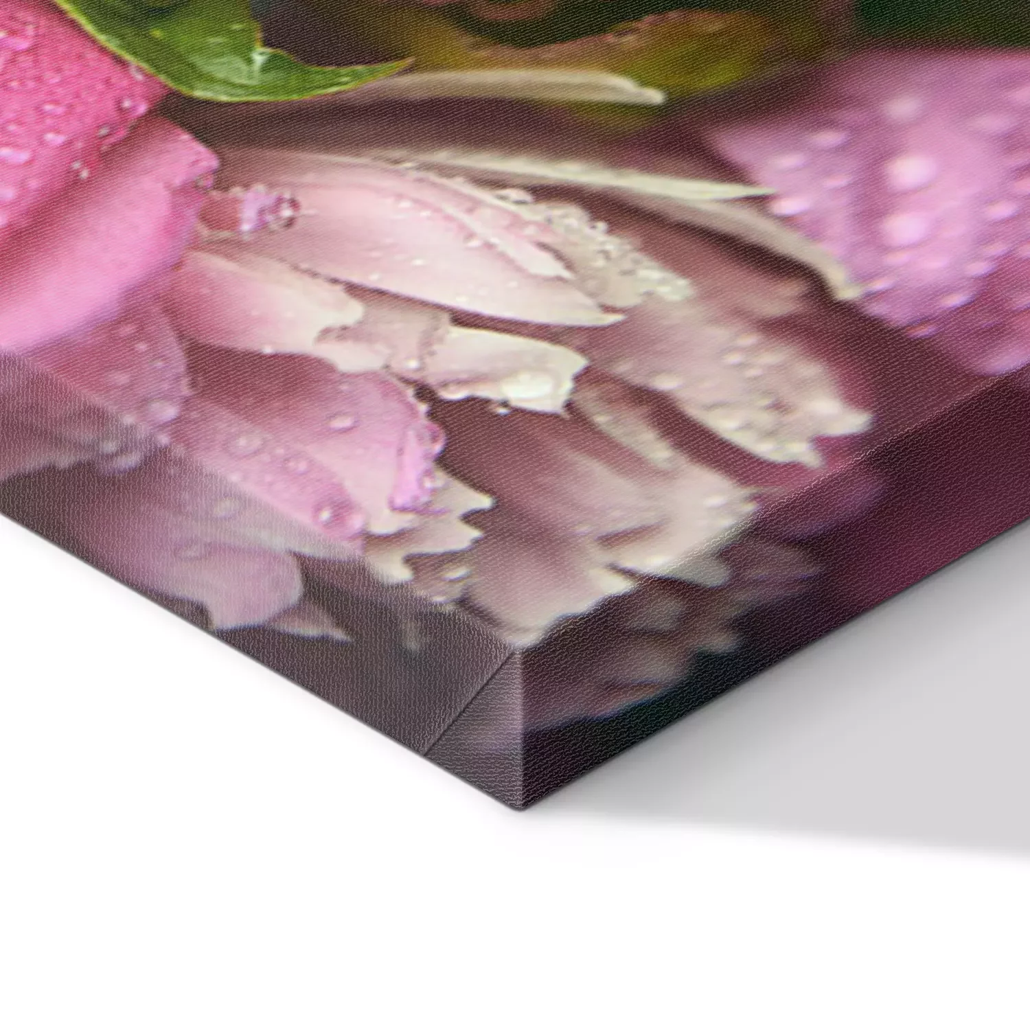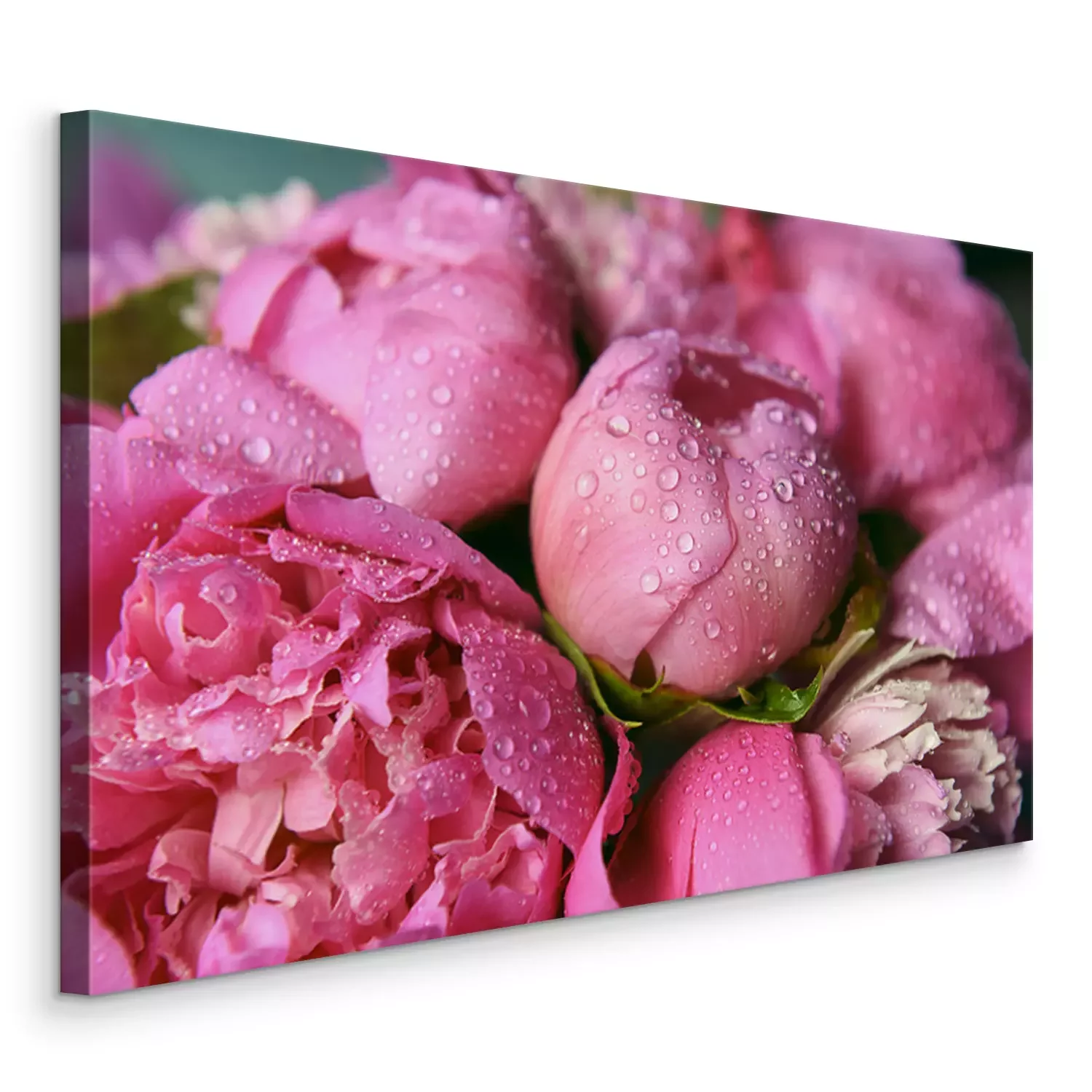 Canvas: delicate verse bloemen en knoppen grote roze pioenen met druppels na regen close-up