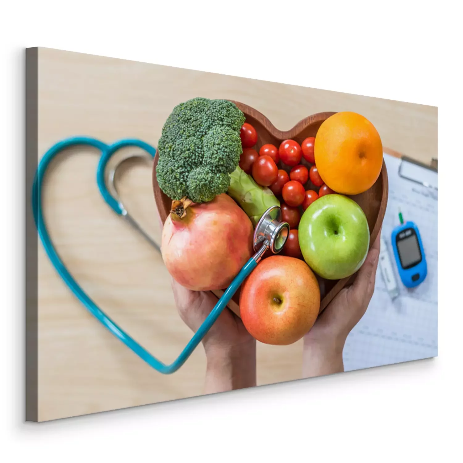 Canvas Diabetes monitor, cholesterol dieet en gezond voedsel eten voedingsconcept met schone vruchten in de voedingsdeskundige hartschotel en patiënt's bloedsuiker controle record met diabetische meetinstrum