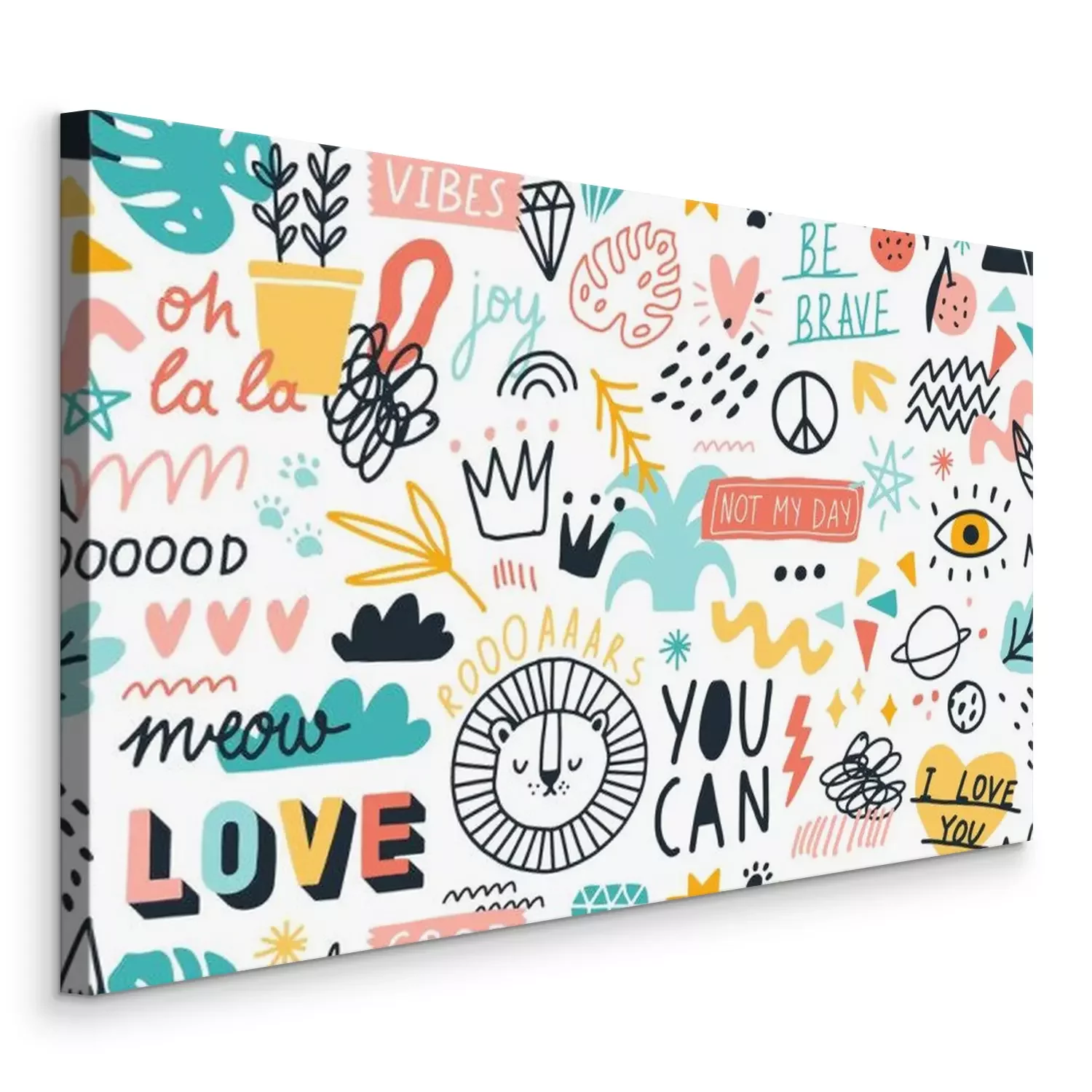 Canvas Different hand drawn design elements animals, plants, symbols and handwritten slogans seamless pattern. Various colorful phrases and inscriptions on white. Vector flat illustration in doodle style