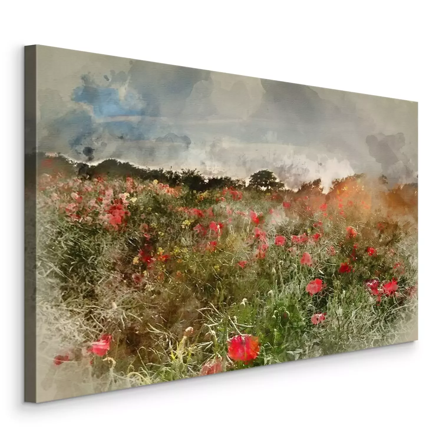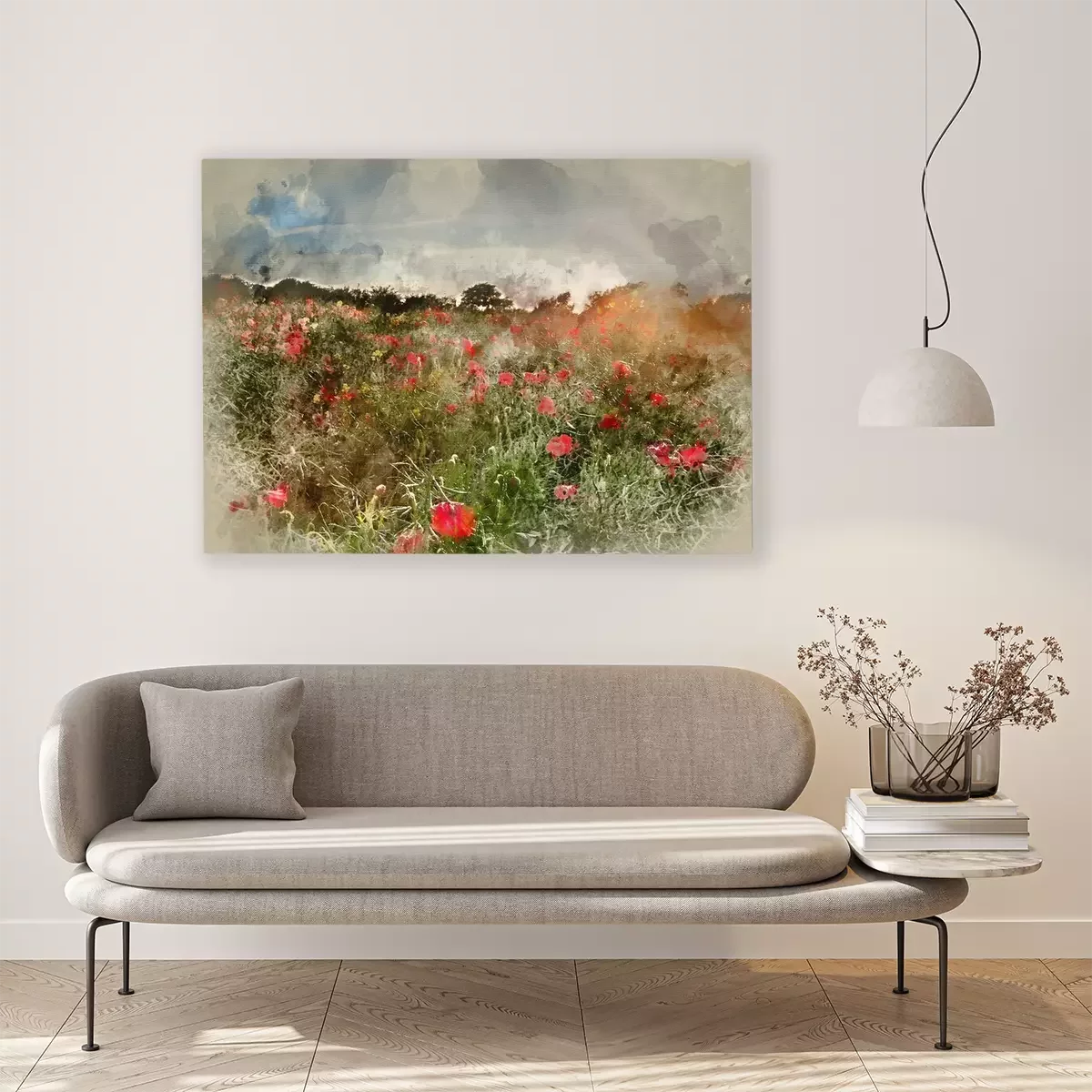 Canvas: Digital watercolour painting of Poppy field landscape in English countryside in Summer