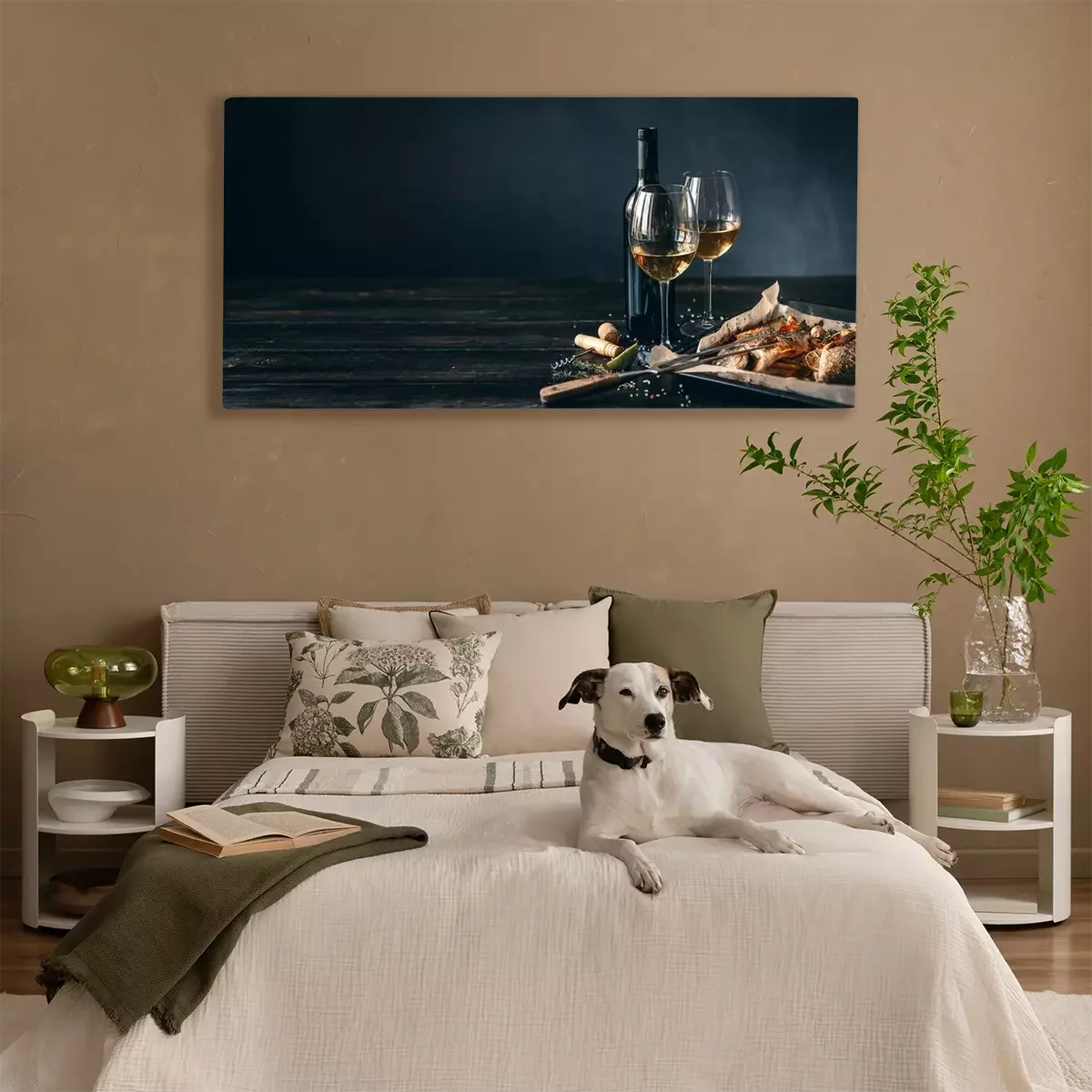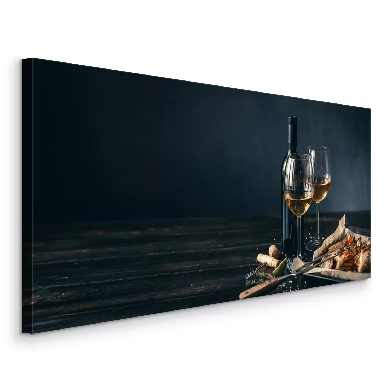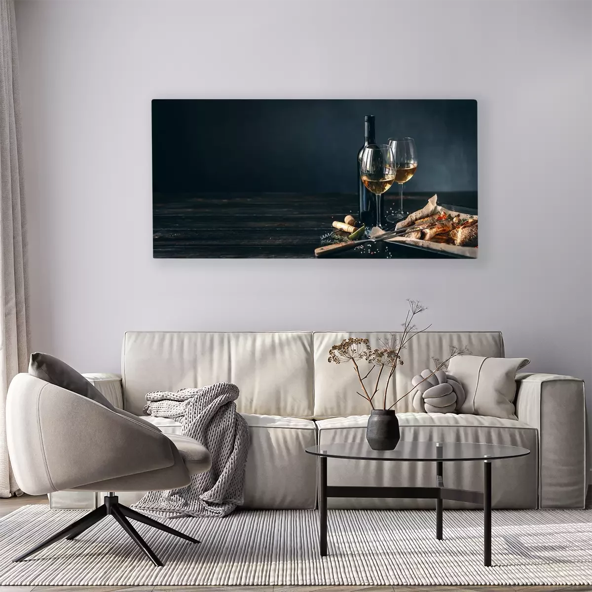 Canvas dinner concept for two. two glasses of white wine, baked fish.