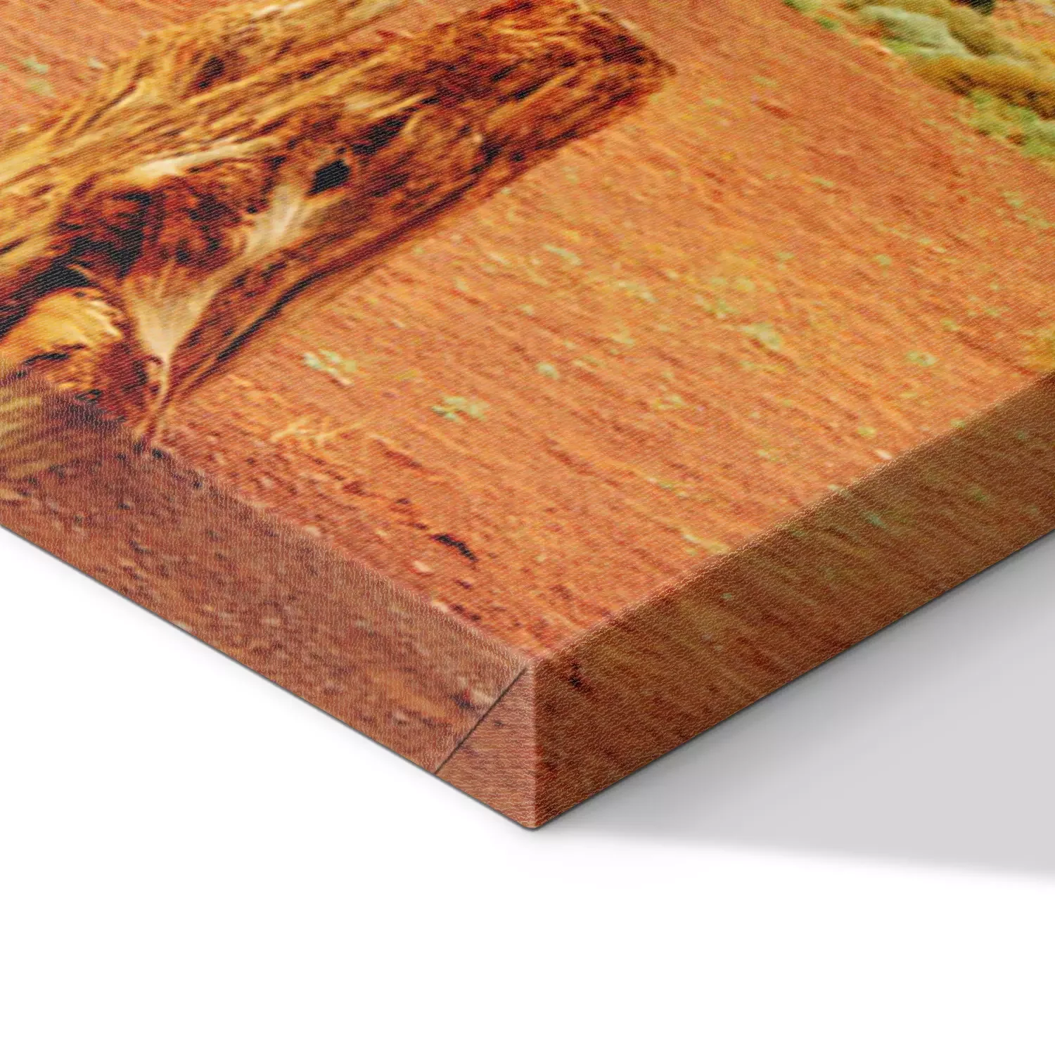 De print wordt aangebracht op hoogwaardig canvas dat op een schildersweefgetouw (spieraam) wordt gespannen. Omdat de print de zijranden bedekt, hoeft het ontwerp niet met een extra kader te worden omlijst. Wij raden ook composities aan die uit meerdere foto's bestaan en zo een coherente compositie vormen.