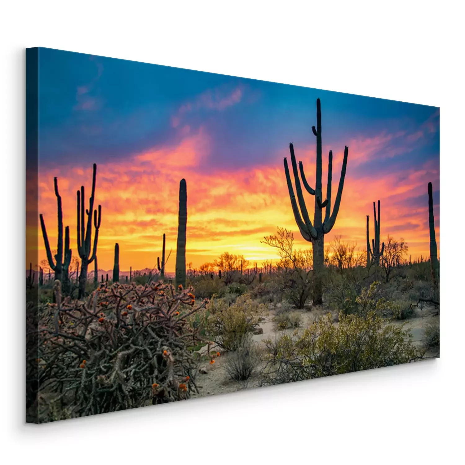 Canvas Dramatic Sunset in Arizona Desert: Colorful Sky and Cacti/ Saguaros in Foreground  - Saguaro National Park, Arizona, USA
