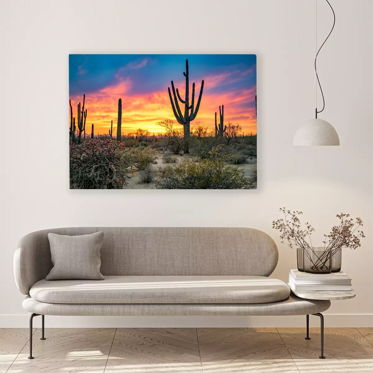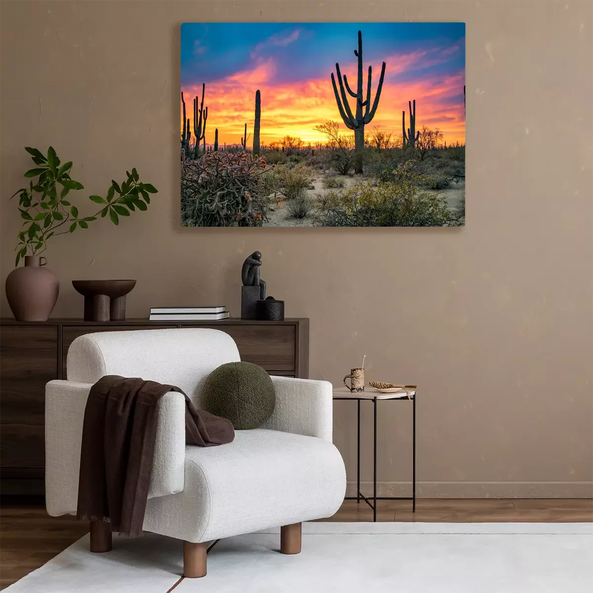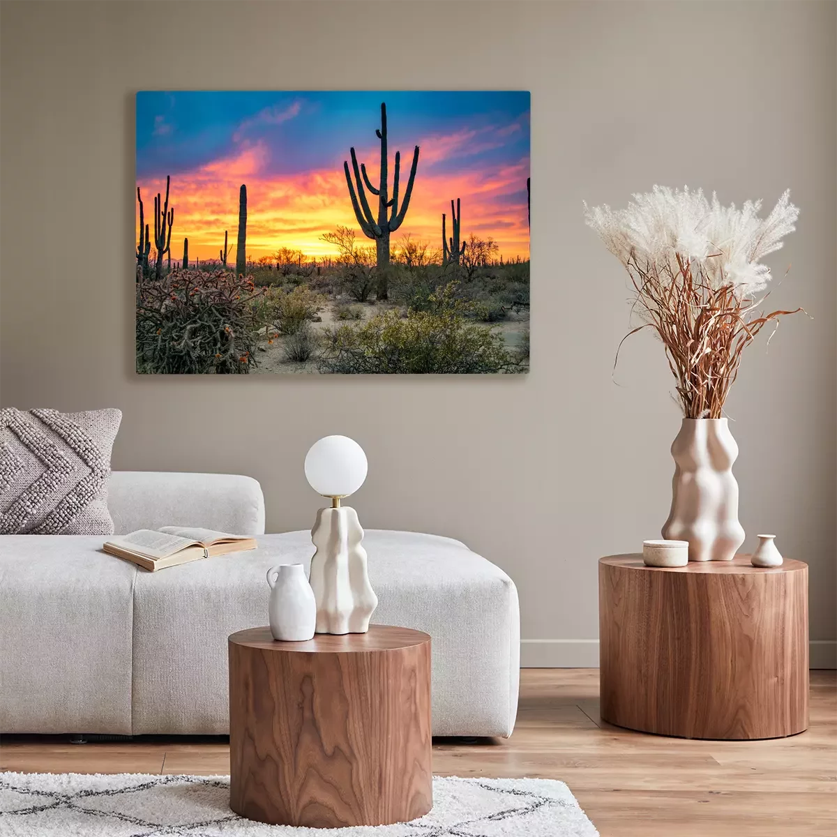 Canvas: Dramatic Sunset in Arizona Desert: Colorful Sky and Cacti/ Saguaros in Foreground - Saguaro National Park, Arizona, USA