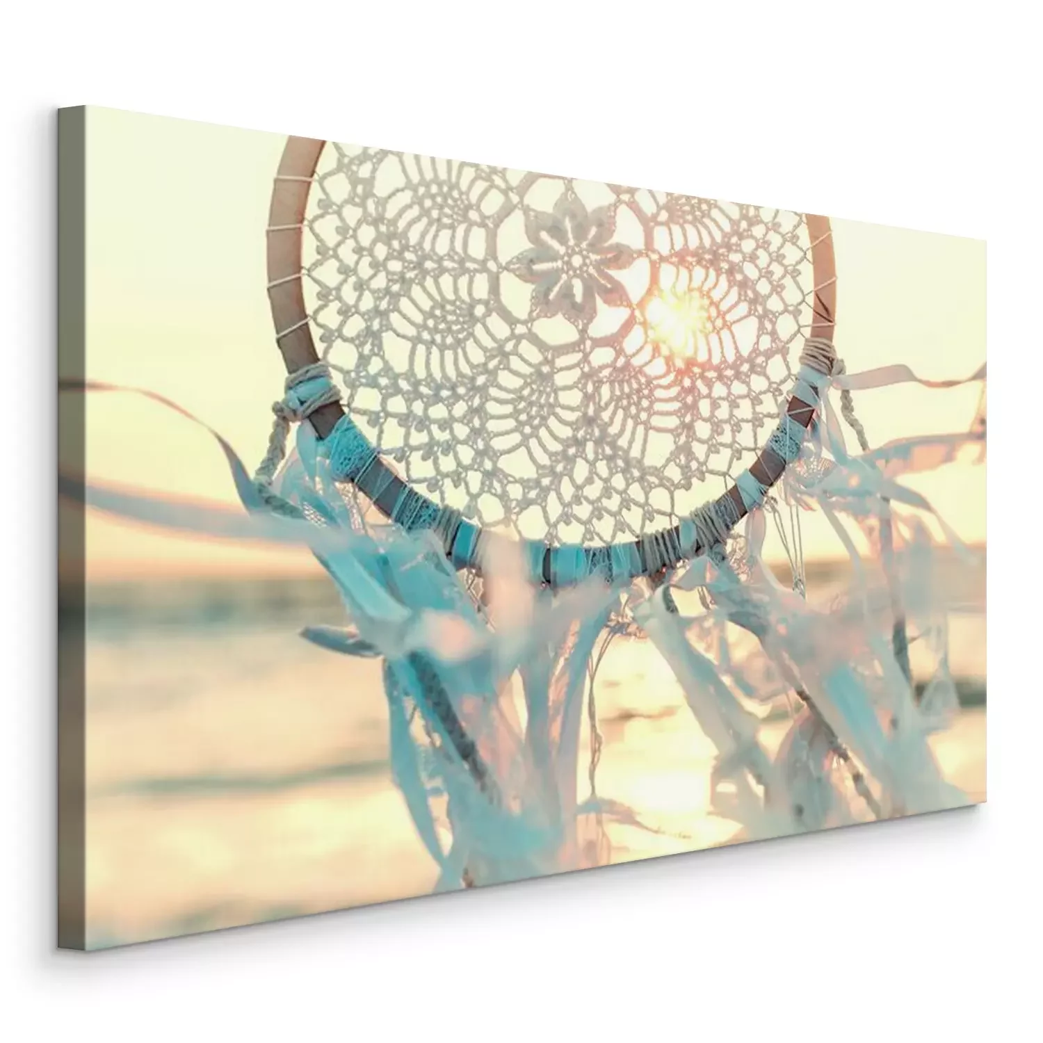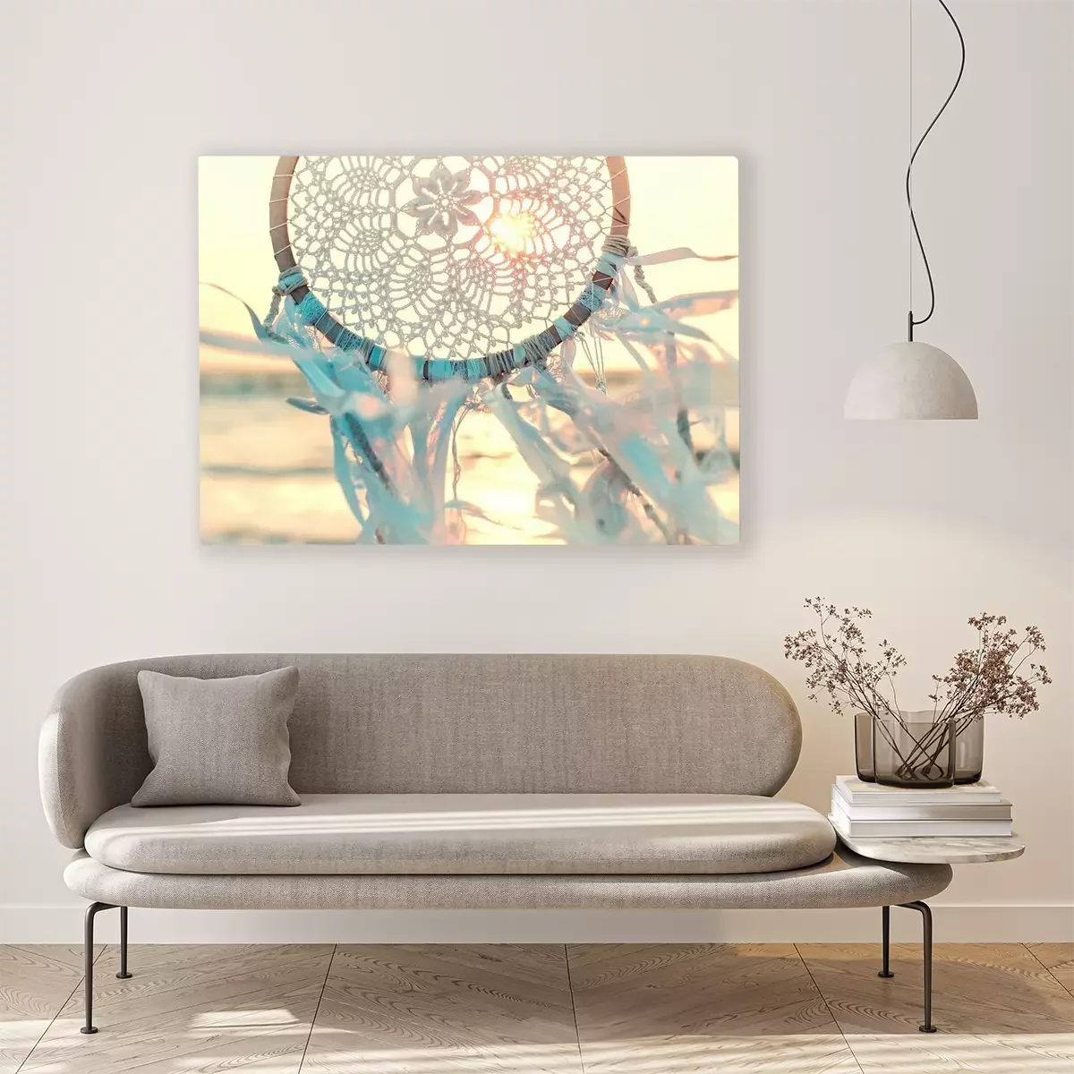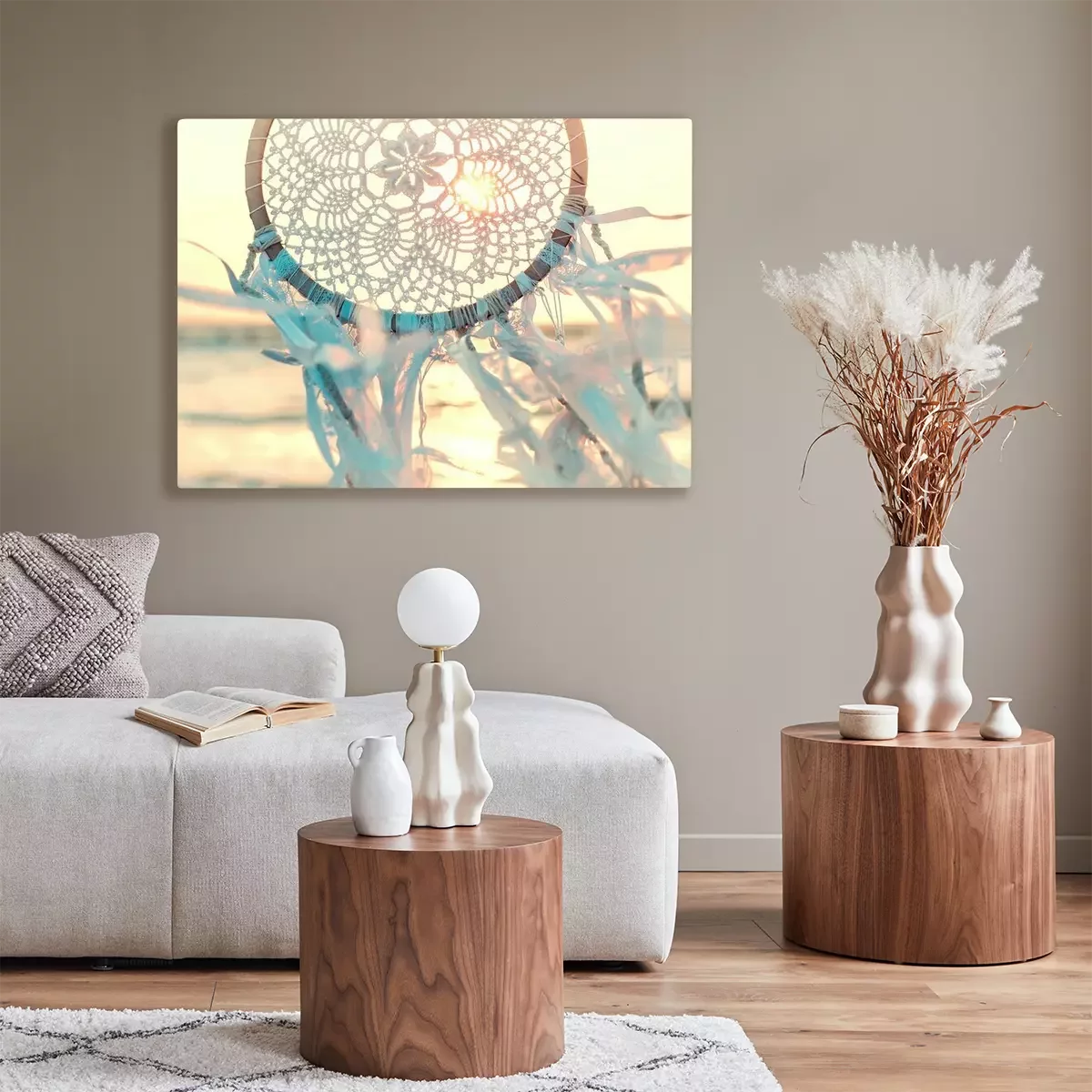 Canvas: Dream catcher against sunrise. Handmade work is ethnic symbol