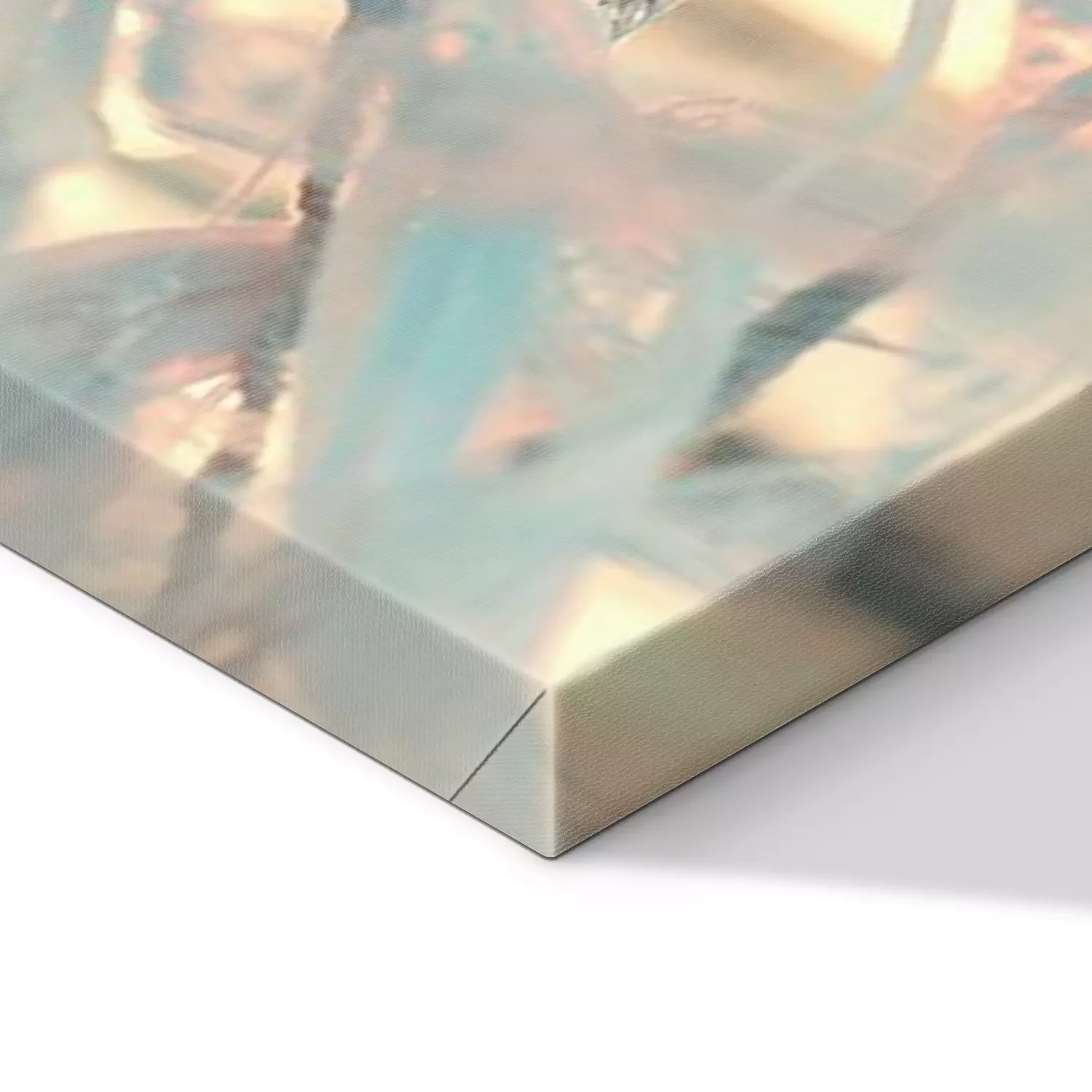 De print wordt aangebracht op hoogwaardig canvas dat op een schildersweefgetouw (spieraam) wordt gespannen. Omdat de print de zijranden bedekt, hoeft het ontwerp niet met een extra kader te worden omlijst. Wij raden ook composities aan die uit meerdere foto's bestaan en zo een coherente compositie vormen.
