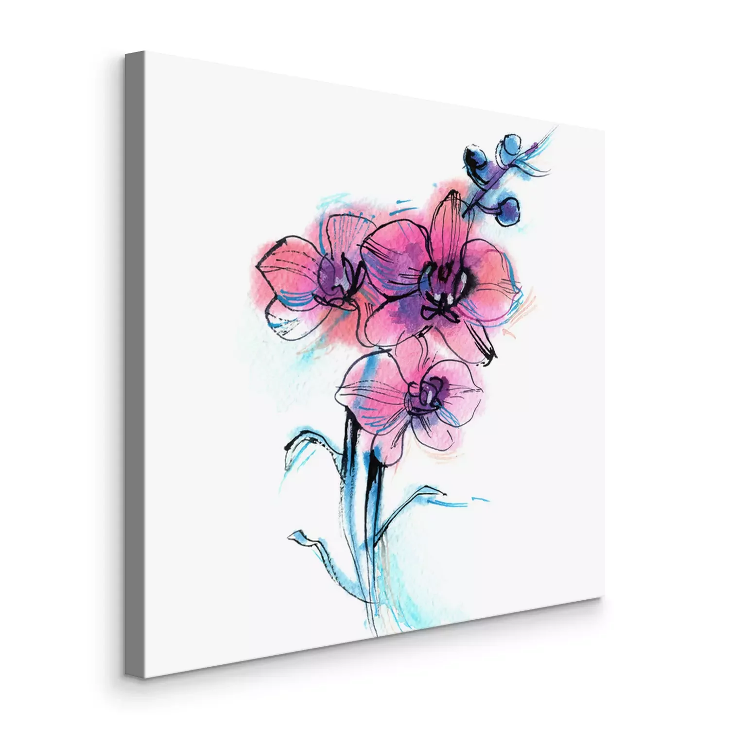 Canvas Drie paarse orchidee, tak, bloem, waterverf schets op een witte achtergrond