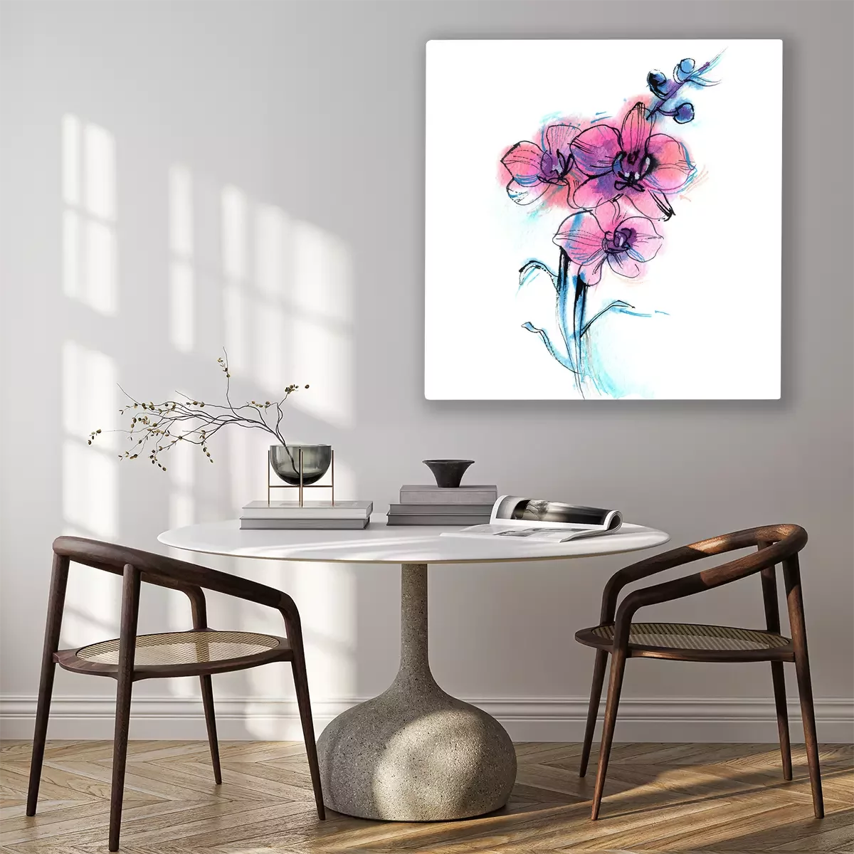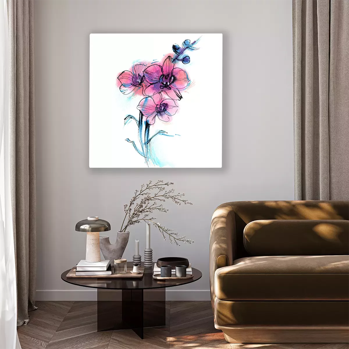Canvas: Drie paarse orchidee, tak, bloem, waterverf schets op een witte achtergrond